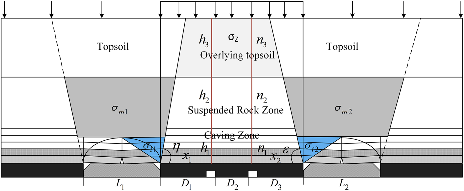 In Eqs 18 and Figure 10 H is the depth of mining, and h1, h2, h3, n1, n2, and n3 are the strata heights in the three zones; are the excavation angles; x1 and x2 are the goaf-affected distances in the lateral side; are the peak values of transfer stresses from the excavated zone and the suspended zone, respectively. L1 and L2 are the widths of the goafs, D1, D2, and D3 are the widths of the coal pillars in the different areas of the goaf on both sides. Ki1 and Ki2 are the stress transfer coefficients in the excavated zone.