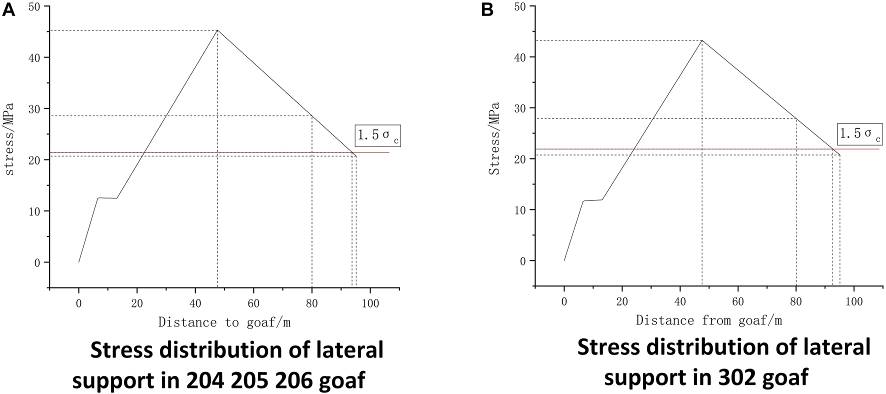 Stress distribution diagram of lateral support. (A) Stress distribution of lateral support in 204 205 206 goaf, and (B) Stress distribution of lateral support in 302 goaf
