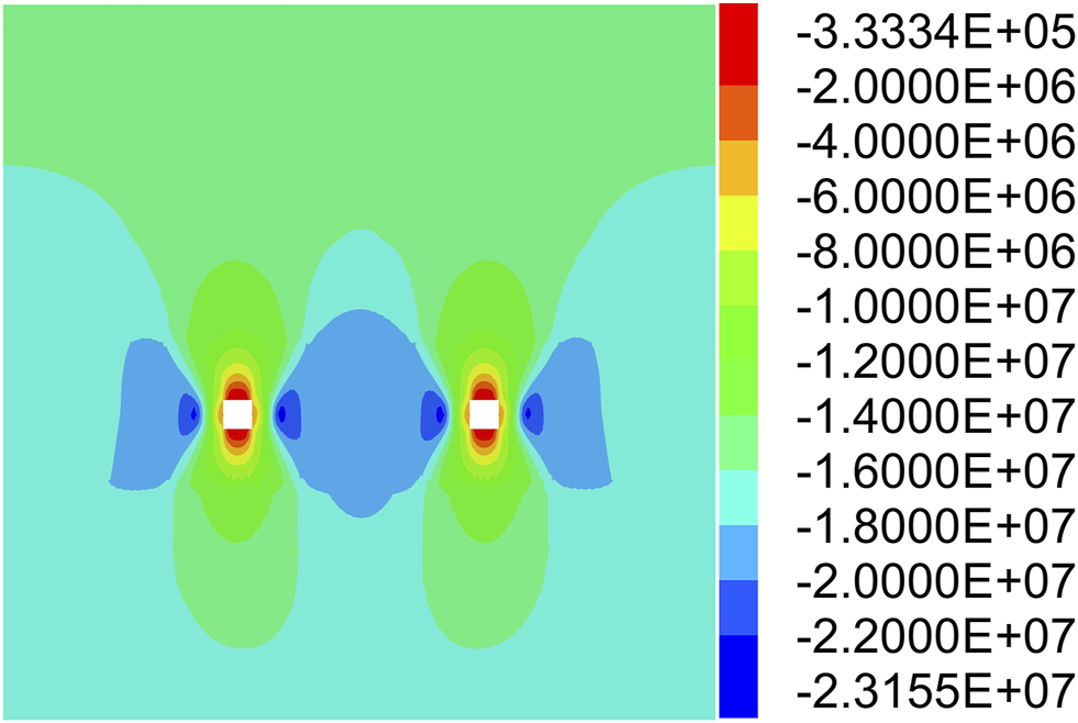 Figure 13 shows a 20-m gap between the tunnels, and the coal cut by the tunnels is subject to a concentration of stress, with a peak value of up to 23.15 MPa. According to the rockburst index, a rock burst would occur when the stress applied to the coal was greater than 1.5 times the uniaxial compressive strength ( 22.5 MPa).