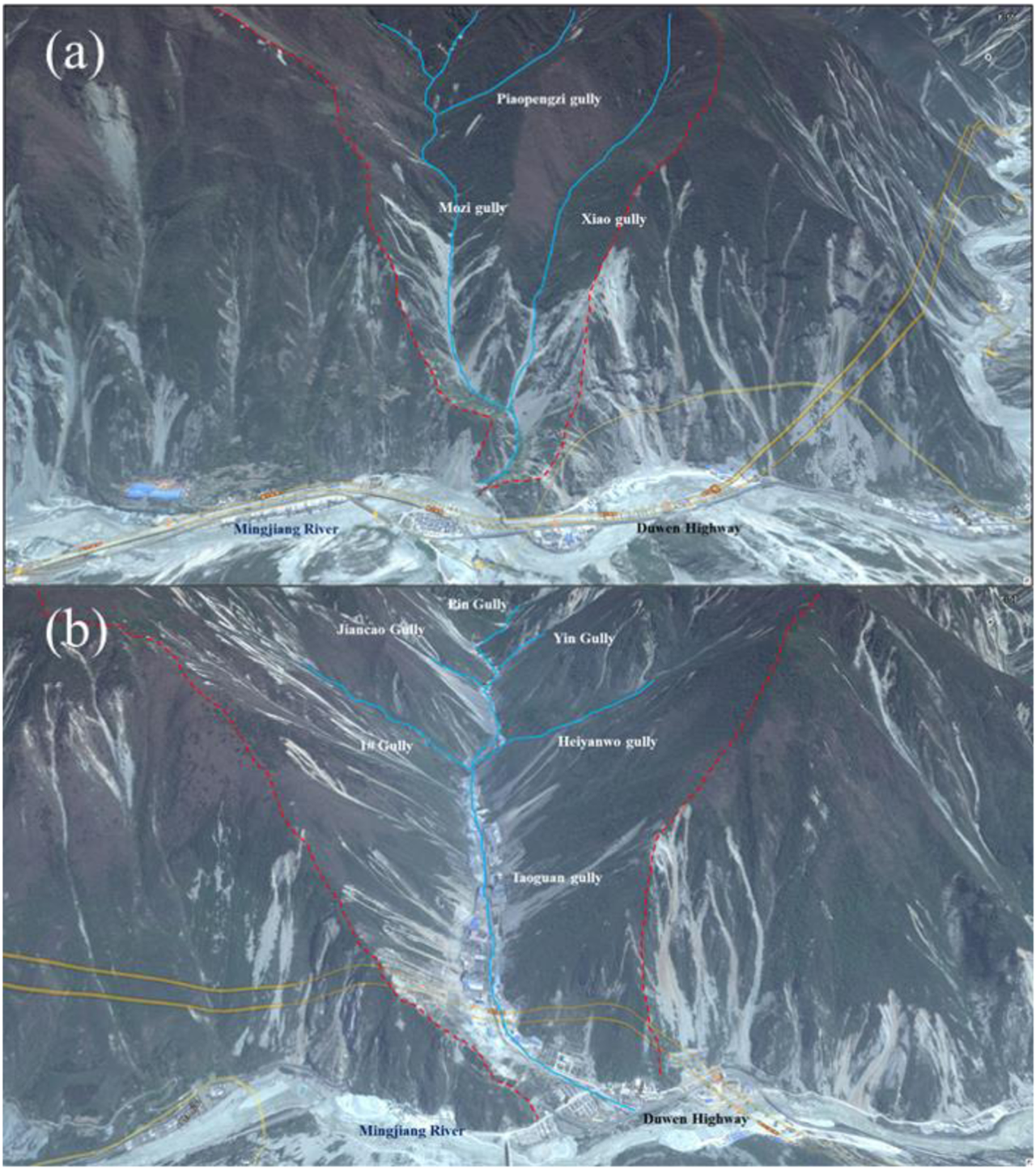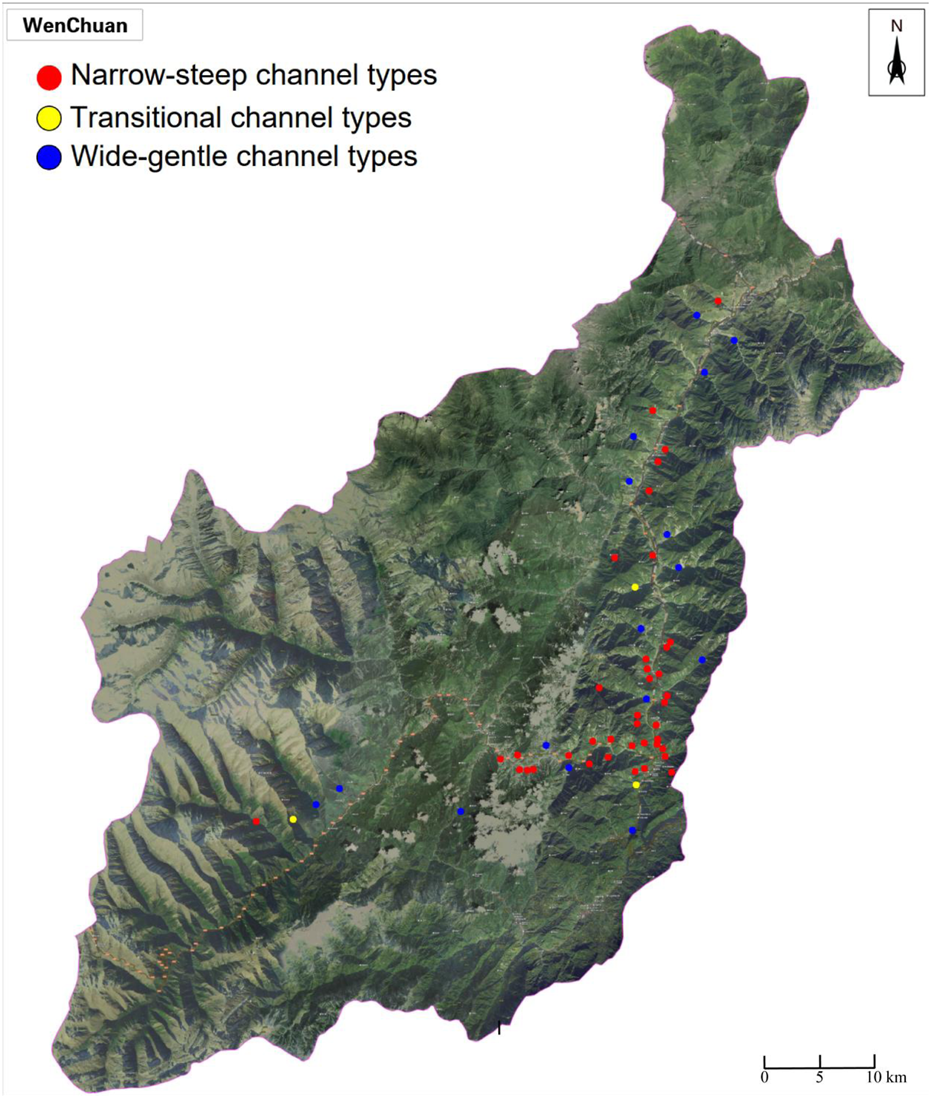 In past years, debris flow researches mainly focused on two types of debris flows: Slope debris flow and gully debris flow. Debris flows that have occurred after the Wenchuan earthquake in Southwest China have different formation mechanisms, erosion, deposition characteristics, and secondary disaster chain (Han 2016). Several research teams have studied the type of debris flows in this region. Yang et al. (2012) proposed the concept of narrow-steep channel type debris flow after studying 67 mudslide ditches that occurred in five areas of the Wenchuan meizoseismal area from 2008 to 2013 and analyzed their unique management difficulties and corresponding prevention and control countermeasures (Yang et al., 2015; Yang et al., 2020). Based on the characteristics of 13 debris flows along the Duwen Expressway in 2013, Han (2016) divided the channel-type debris flows into two categories, narrow-steep and wide-gentle, and discussed their disaster mechanism. For each of them, the prevention measures were then given by Han et al. (2018). After analyzing the parameters of 145 debris flows that erupted after the Wenchuan Earthquake, Chen et al. (2018) proposed the concept of urgent-steep gully debris flows, summarized their motion and dynamic characteristics, and Li et al. (2020) studied their initiation characteristics through flume experiment. The above-mentioned “narrow-steep” and “urgent-steep” gullies refer to a kind of debris flow gully with a small watershed area, narrow flow channel, and steep channel gradient, in which the debris flow erupts, moves swiftly and violently. The term “narrow” describes the character of the width of the overall watershed and flow channel, while “urgent” and “steep” are used to indicate both the overall and the flow channel gradient. Therefore, we use narrow-steep type to describe this kind of debris flow gully, while the gullies with opposite characteristics are defined as a wide-gentle type.