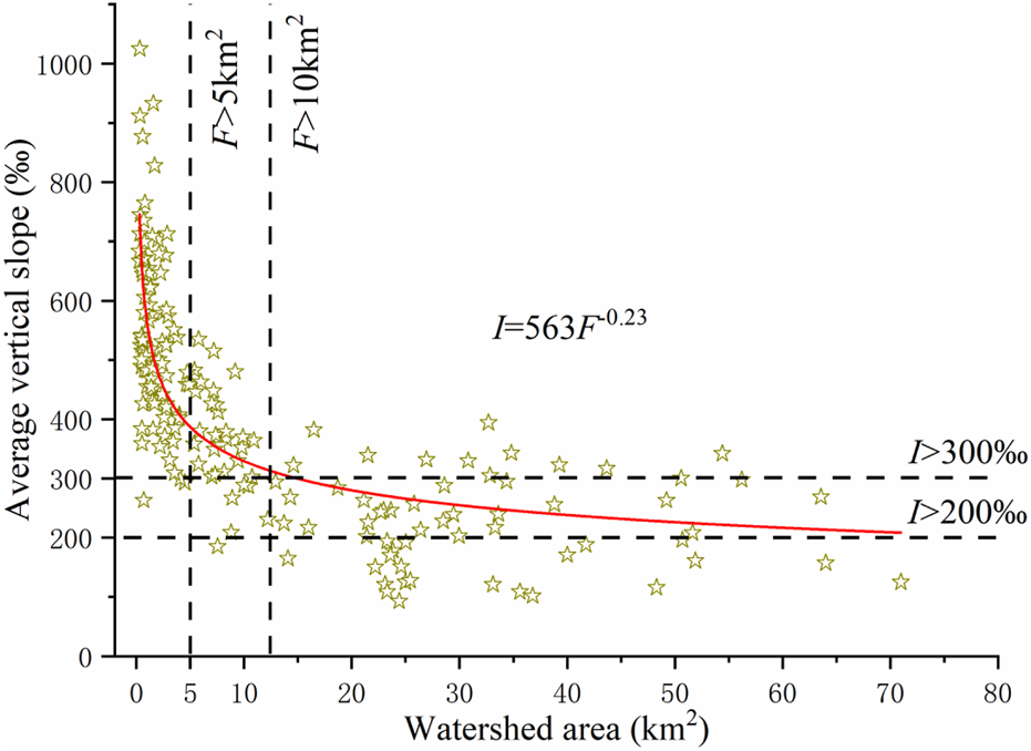 Figure 2 shows that the gully average vertical slope tends to decrease with the increasing watershed area, and their relationship satisfies the curvilinear distribution of the dimensionless power function (Qu and Xiao 2018; Lyu et al., 2022). 68.91% of the gullies with the average vertical slop are gathered in the watershed area , representing the narrow-steep debris flow gully. 95.65% of gullies with the average vertical slop are clustered in the watershed area , representing wide-gentle gullies. This phenomenon can be explained as when the watershed area is small, the gully is in the formation-development stage, the effect of water flow downcutting erosion is severe, shaping high slope gradients and gully-bed ratios; With the increasing of the catchment area, the gullies evolution comes to an end, the degree of channel incision decreases, making it hard to satisfy the hydrodynamic conditions required to initiate a debris flow.