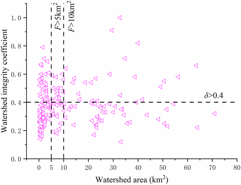 Watershed integrity factor and catchment area of 145 channel-type debris flows in the meizoseismal area (Chen et al., 2018).