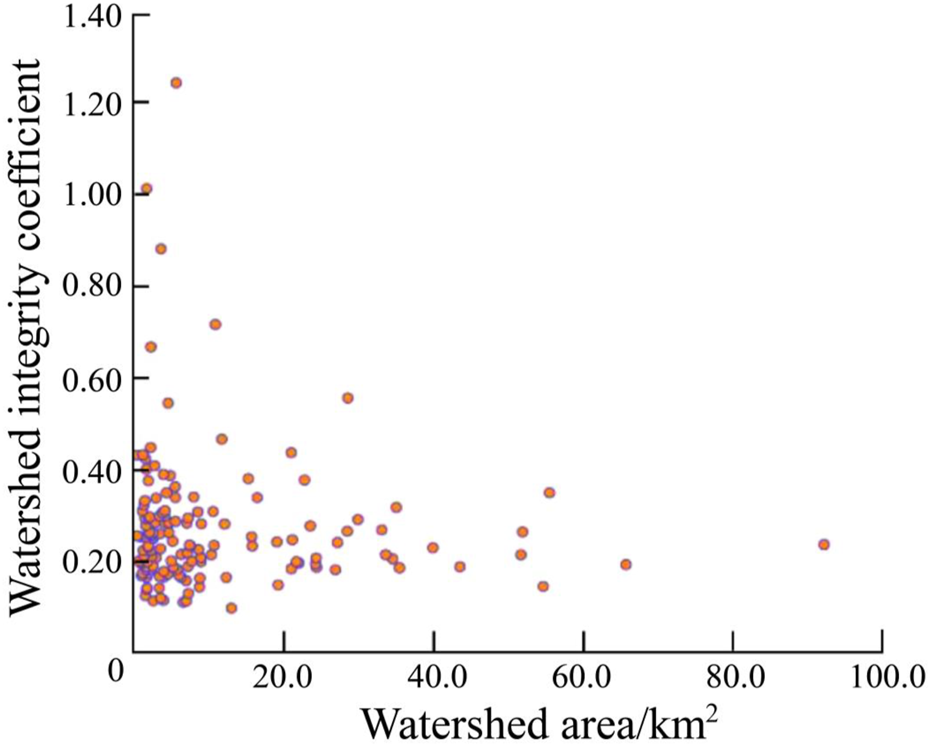 Watershed integrity coefficients versus watershed area of 176 channel-type debris flow gullies in the meizoseismal areas.