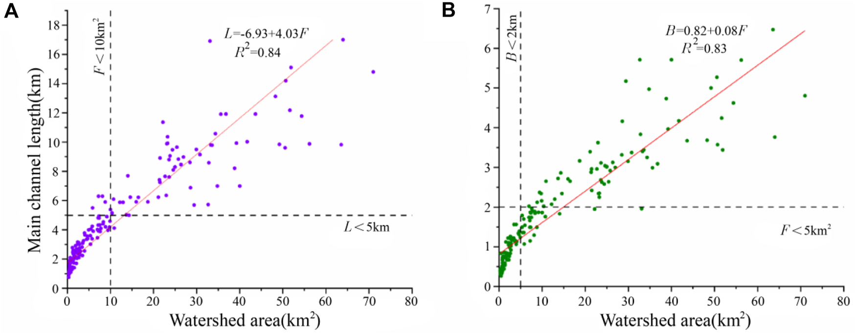 The equation B=F/L can calculate the average watershed width because the main channel length is consistent with the watershed length. Figure 5 shows 63.6% (112) gullies are satisfied with condition B<2 km, indicating that the long-narrow basin form is typically characteristic of gullies in the meizoseismal area. The relationship of watershed area and average watershed width satisfy a linear distribution (R2=0.83) and under the condition of F<5 km2 for narrow-steep gullies, the average basin widths all satisfy B<2 km, so B<2 km is used as a secondary discriminant.