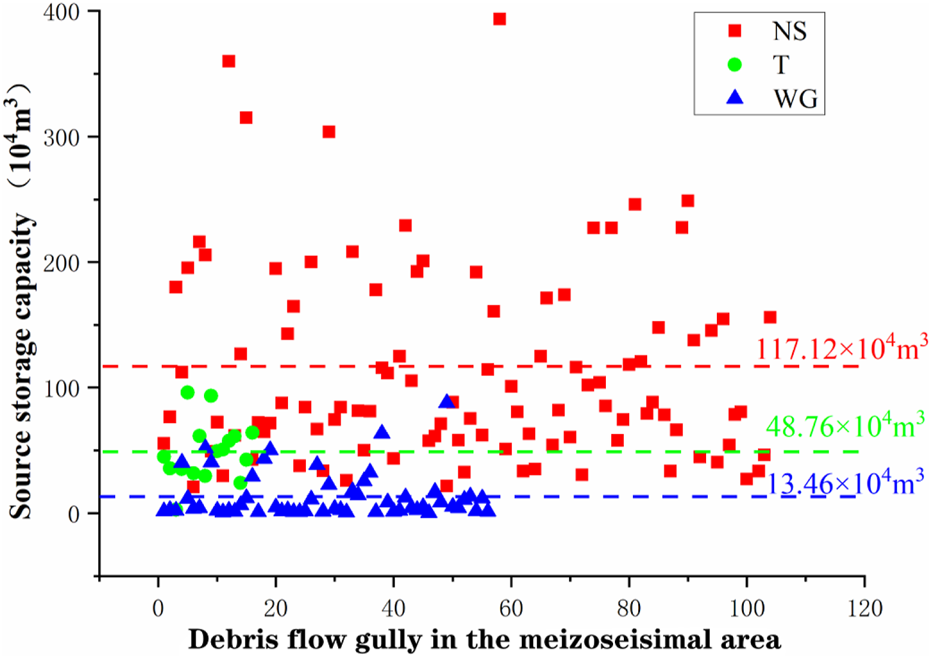 Figure 9 shows the amount of source storage per km2 for three types of debris flow gullies. The average volume of narrow-steep, transitional, and wide-gentle debris flow gully are 117.12×104 m3/km2, 48.76×104 m3/km2, and 13.46×104 m3/km2, respectively. The source storage capacity per unit area of narrow-steep debris flow gully is 8.7 times greater than that of the wide-gentle type, which indicates the narrow-steep gully is more prone to debris flow occurrence.