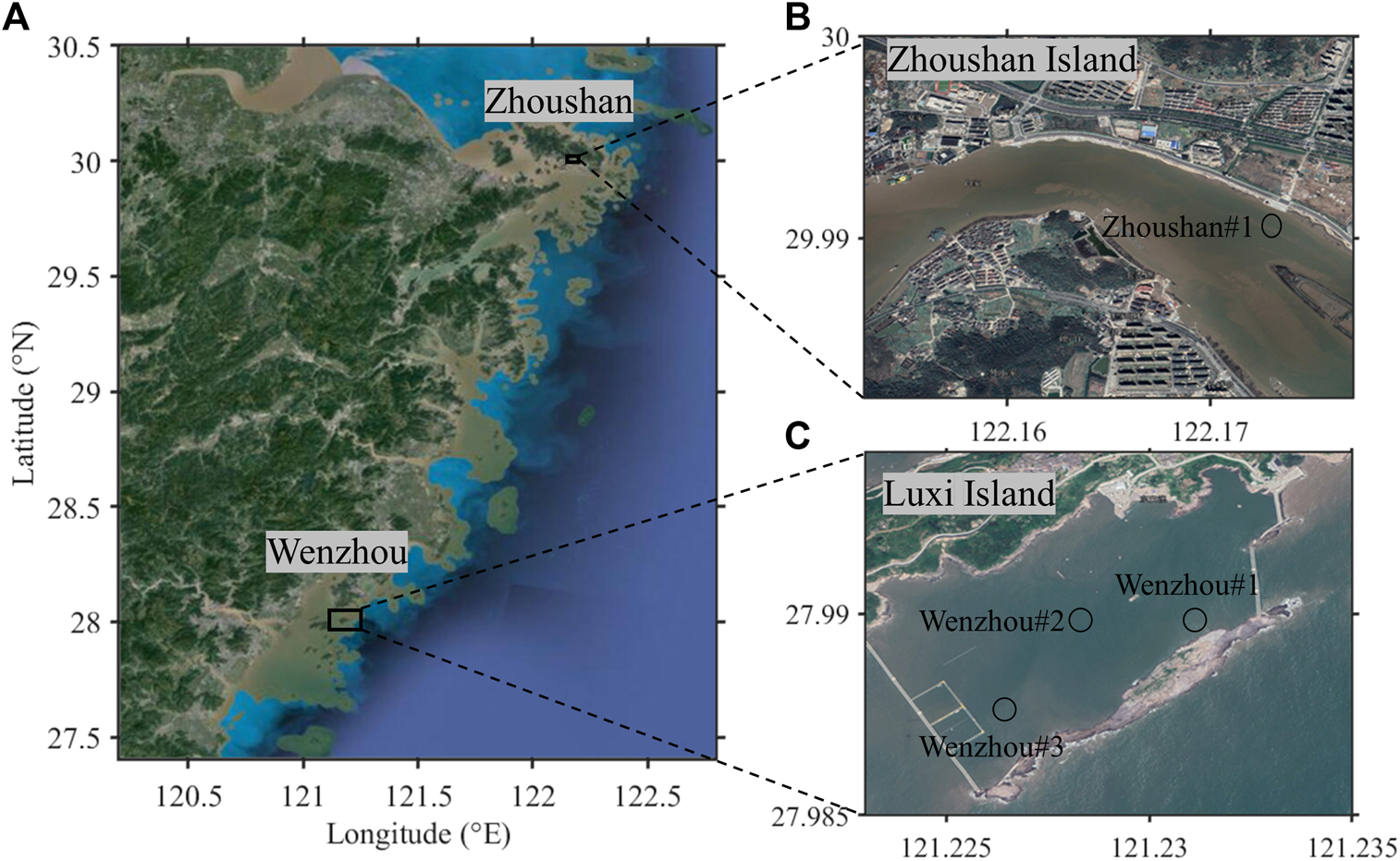 (A) Geographical location of Luxi Island and Zhoushan Island; (B) and (C) depict the selected location in Zhoushan Island and Luxi Island for collecting natural mud samples.