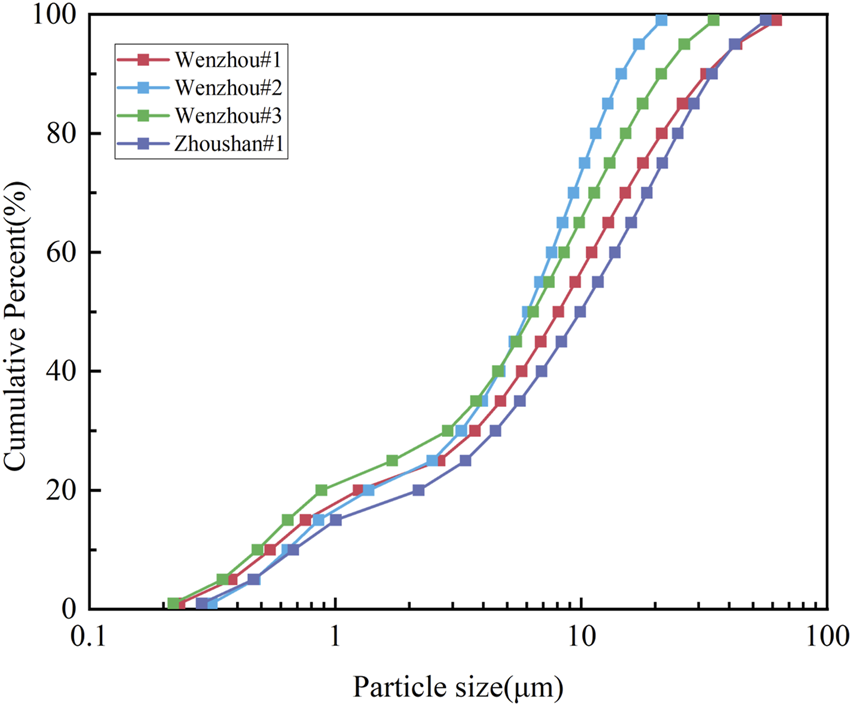 Particle size distributions of the natural mud samples were determined using static light scattering methods (Malvern MasterSizer 3000), and the results are given in Figure 2. To determine the density of the mud samples, small amounts of each mud sample were dried at 105°C for 24 h in a drying box, and the corresponding water content of each mud sample was determined by calculating the weight difference between the mud sample before and after drying. The dry density of the mud samples was assumed to be 2,650 kg/m3, based on the water content of each mud sample, and the bulk density of the mud samples was obtained. The characters of the four mud samples are summarized in Table 1.