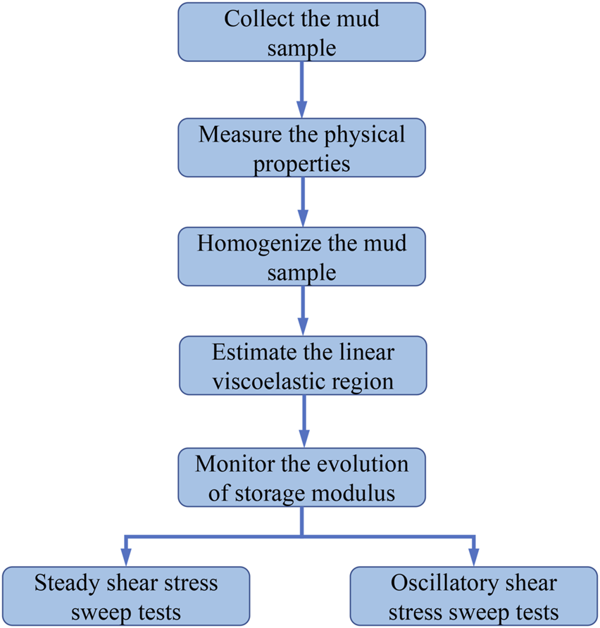 In the shear stress sweep tests, the applied shear stress logarithmically increased from 1 to 300 Pa, and the corresponding motor displacement was recorded; thus, the shear rate and apparent viscosity can be determined. In the oscillatory amplitude sweep tests, the natural mud was applied to sinusoidal shear stress which increases logarithmically from 1 to 200 Pa at a constant frequency of 1 Hz, and the rheological parameters such as storage modulus (G′) and loss modulus (G″) are obtained. To obtain adequate experimental data for analysis, twenty measuring points were set in each decade with a measuring time of 15 s for each point for both steady and oscillatory shear stress tests. The technology flow of the experiments is given in Figure 3.