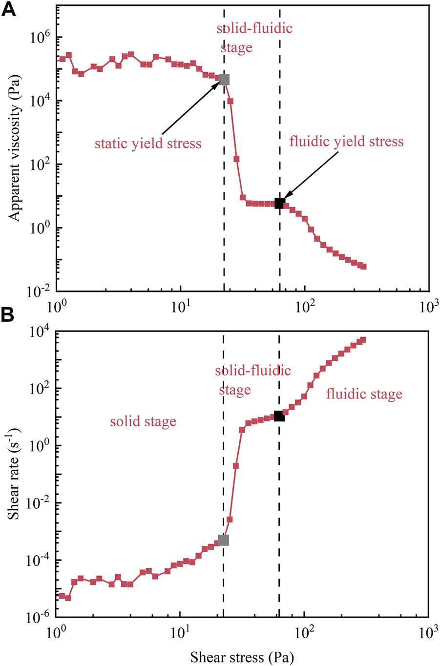The apparent viscosity (A) and shear rate (B) evolution with increasing shear stress of the Wenzhou#1 mud sample. In the figure, the grey point and the black point represent the first yielding point and second yielding point of the Wenzhou#1 natural mud sample, respectively.