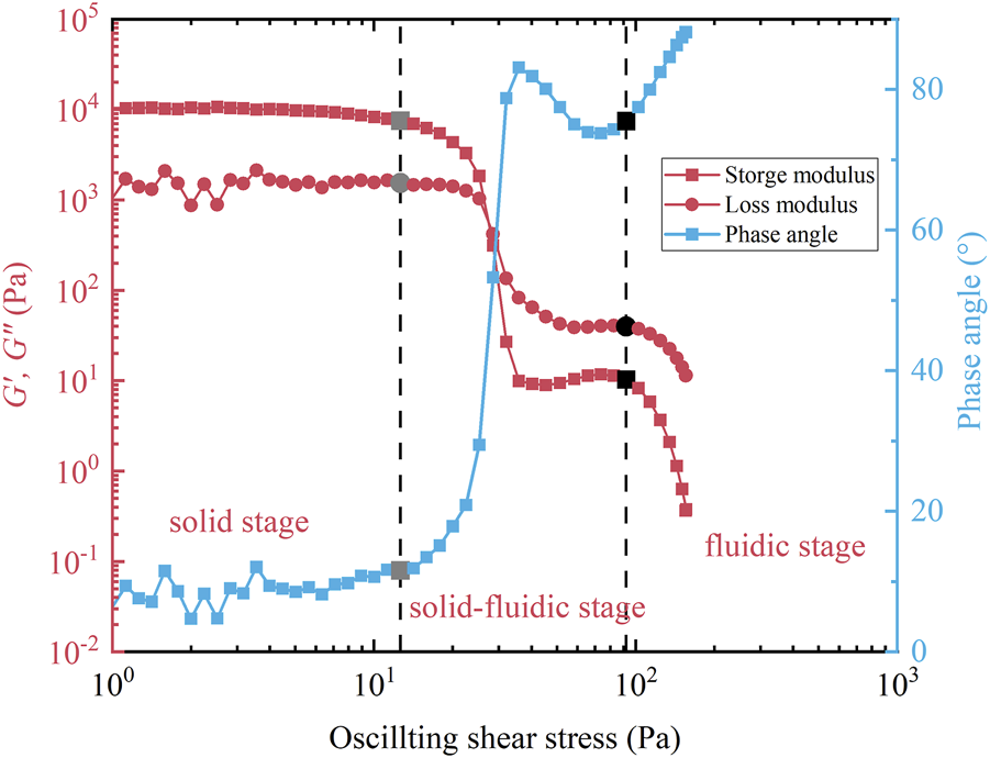 Results of amplitude sweep tests for Wenzhou#1 mud samples, the storage modulus G′, the loss modulus G″, and phase angle evolution with increasing oscillatory shear stress. In the figure, the grey point and the black point represent the first yielding point and the second yielding point of the Wenzhou#1 natural mud sample, respectively.