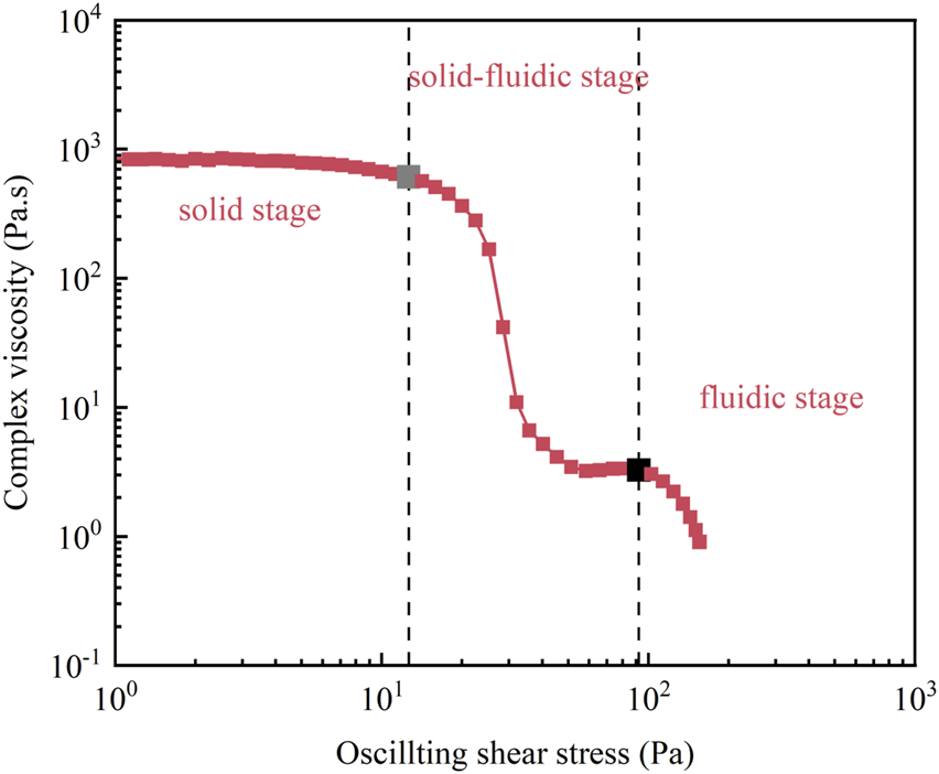 In the second stage, the storage modulus G′, the loss modulus G″, and the complex viscosity experienced a sharp decline and subsequently reached a new state of equilibrium. During this time, the storage modulus decreases faster than the loss modulus and is lower than the loss modulus eventually (Figure 5), indicating that the elastic effect is weakened and the viscous effect dominates in this stage. In the meanwhile, the phase angle given in Figure 5 increases with the oscillatory shear stress and reached around 90° quickly; furthermore, the complex viscosity shown in Figure 6 decreased three orders in its magnitudes, indicating that the internal microstructures of the natural mud sample are gradually destroyed by the imposed oscillatory shear stress, meaning the natural mud yields for the first time and the mud samples experienced the transition from the solid state to the solid-fluidic state.