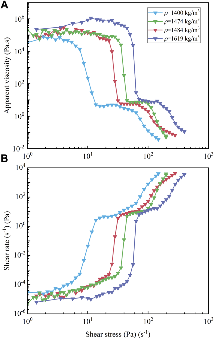 In this study, the natural mud was imposed on the shear stress in the experiments as the natural mud was subjected to the shear stress from exterior loads directly (Shakeel et al., 2020a); thus, the yield stress can be determined directly from the results without extra extrapolation. The experimental results presented show the “two-step” yielding feature of the mud samples; correspondingly, there are two yielding stresses that existed, consistent with the two-step yielding process. The first yielding stress, namely, static yield stress (τs), is the critical stress when the mud samples transform from the solid state to the solid-fluidic state. Similarly, the second yield stress, namely, fluidic yield stress (τf), is the critical stress when the mud samples transform from the solid-fluid state to the fluidic state.