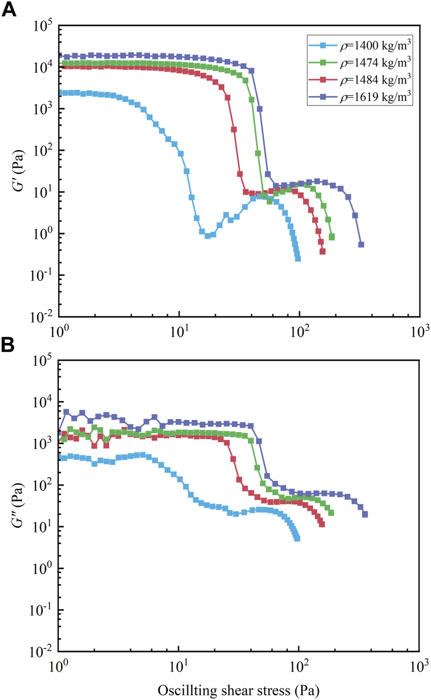 Results of oscillatory stress sweep tests for different mud samples: (A) the storage modulus G′ and (B) the loss modulus G″.