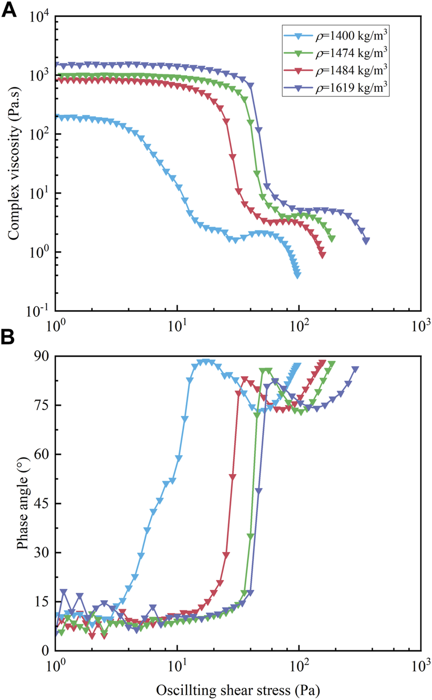 Results of oscillatory stress sweep tests for different mud samples: (A) the complex viscosity and (B) the phase angle evolution versus imposed oscillatory shear stress.