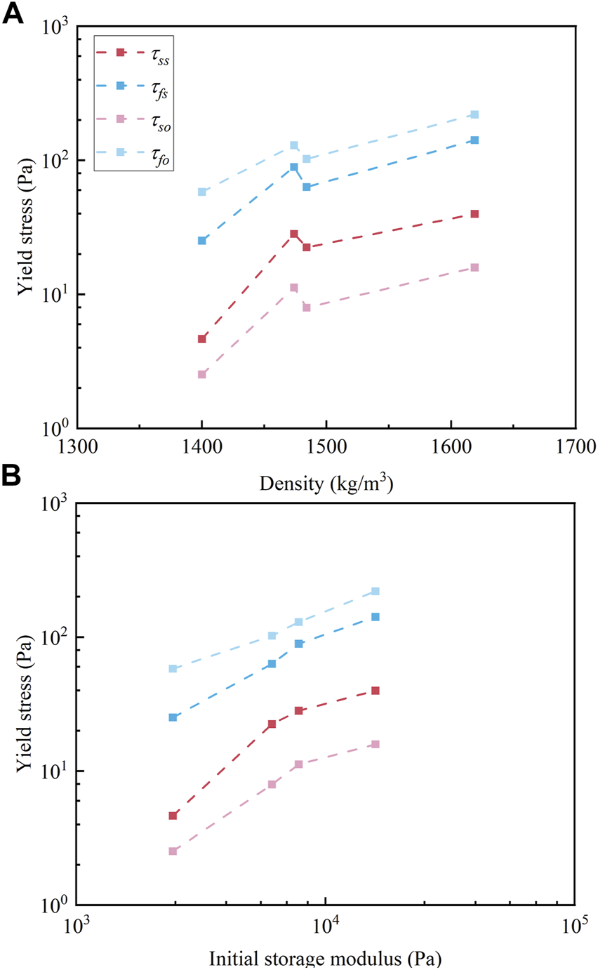 Plots of yield stress versus (A) density and (B) initial storage modulus. The first letter of subscript “s” and “f” of τ denote static and fluidic, respectively, and the second letter of subscript “s” and “o” represent steady and oscillatory, respectively.