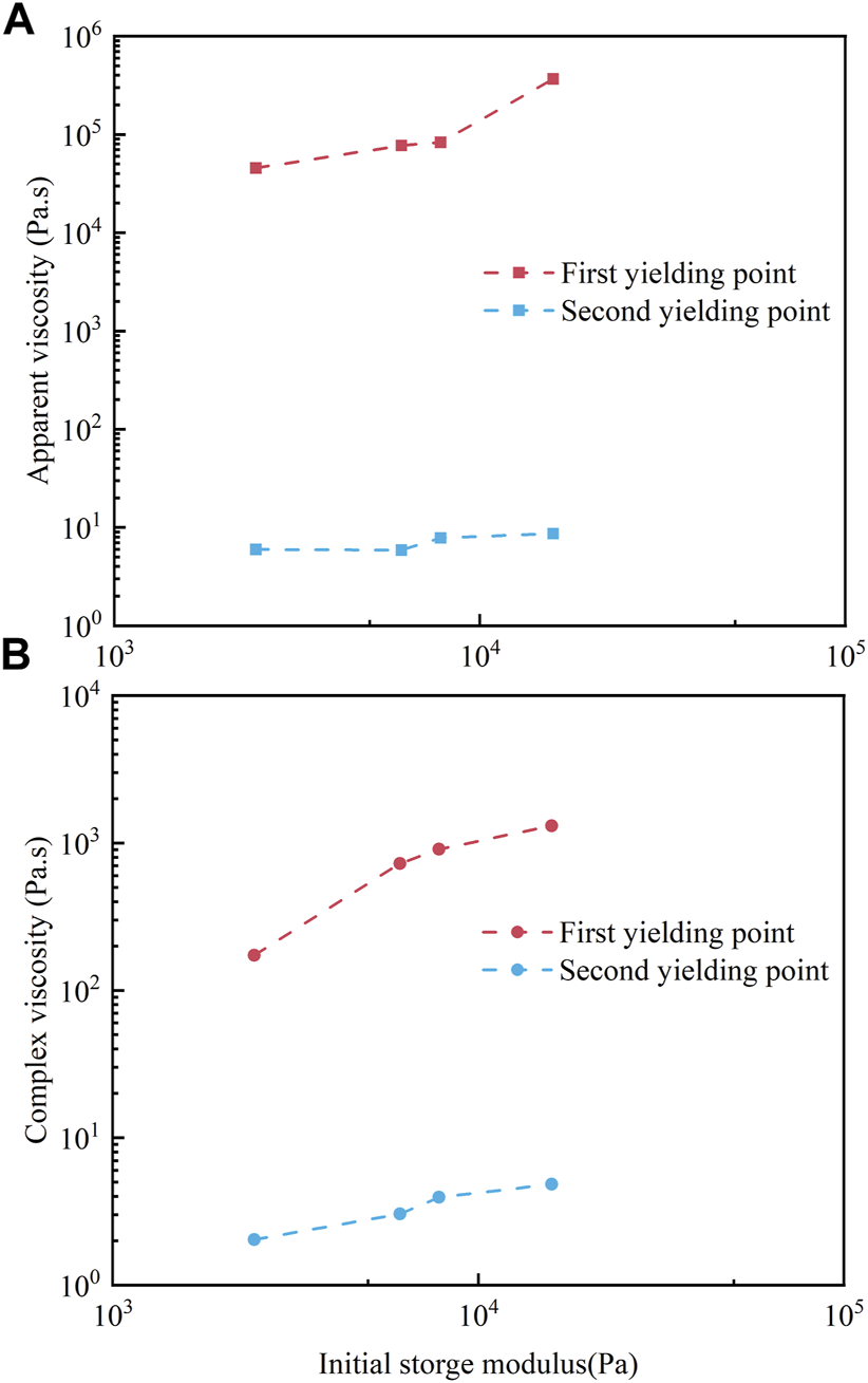 Variations of apparent viscosity (A) and complex viscosity (B) as functions of initial storage modulus.