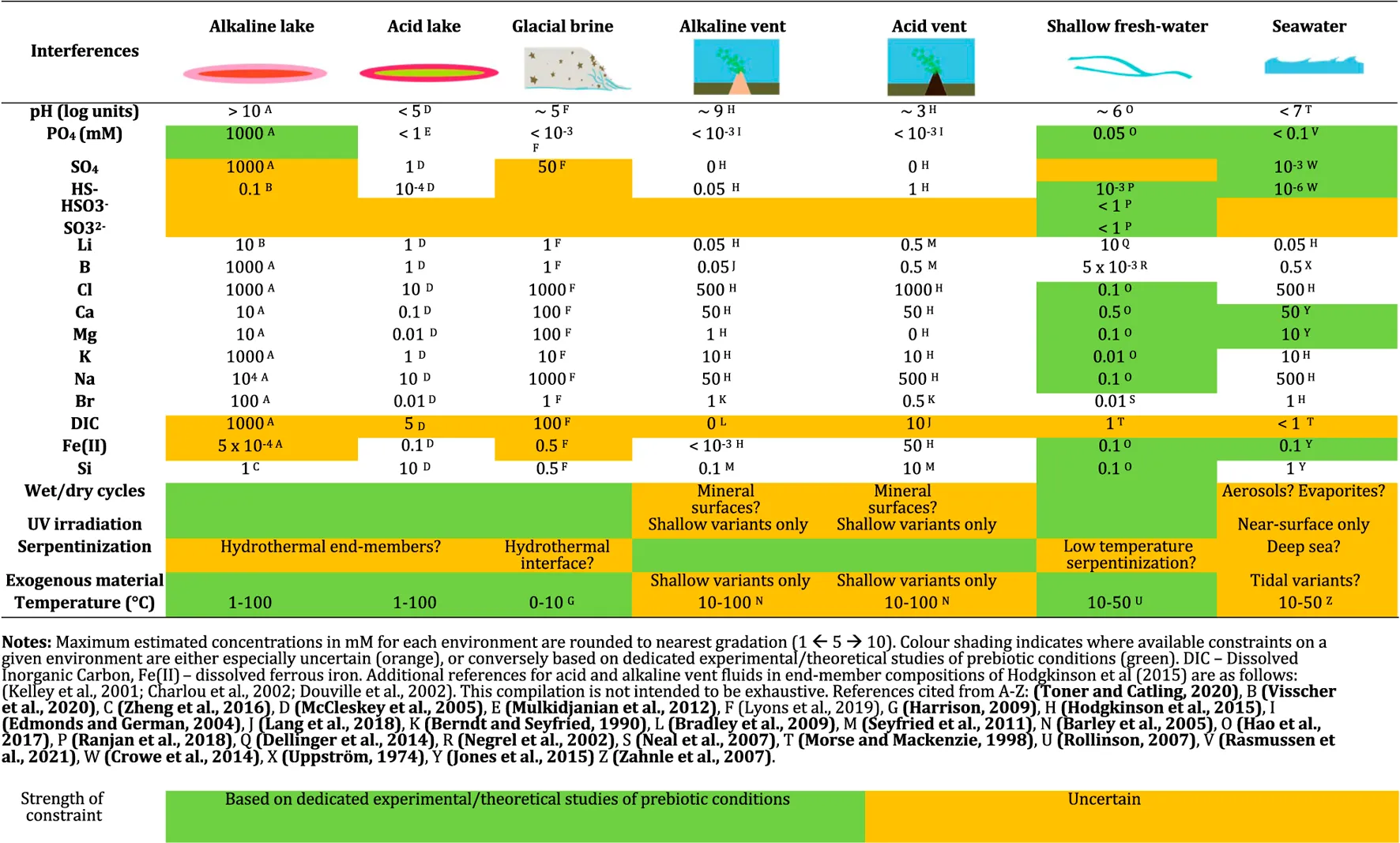 We rely on modern analogues that have been studied in detail as the basis of our compendium, supplemented where possible with what is known about each specific environmental interference on early Earth. Some species found in key environments for prebiotic chemistry are highly sensitive to surface conditions yet have not received detailed modelling or experimental studies relevant to early Earth conditions. In Table 1, such especially uncertain estimates are shaded in orange. Conversely, estimates derived from studies designed to investigate prebiotic and/or early Earth (Archean) conditions are shaded in green.