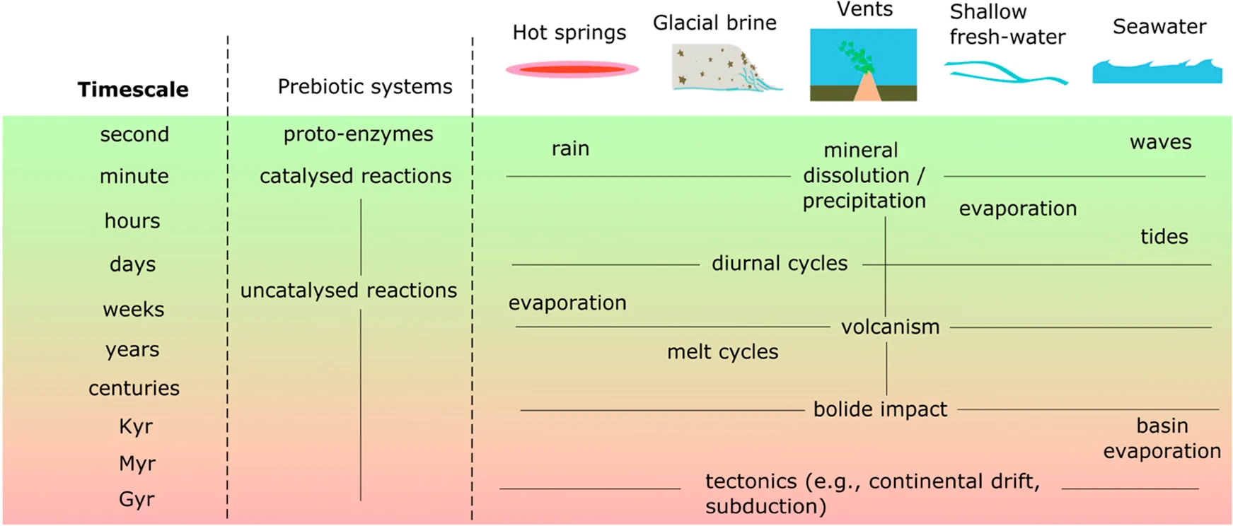 Timescales of prebiotic chemistry and environmental processes.