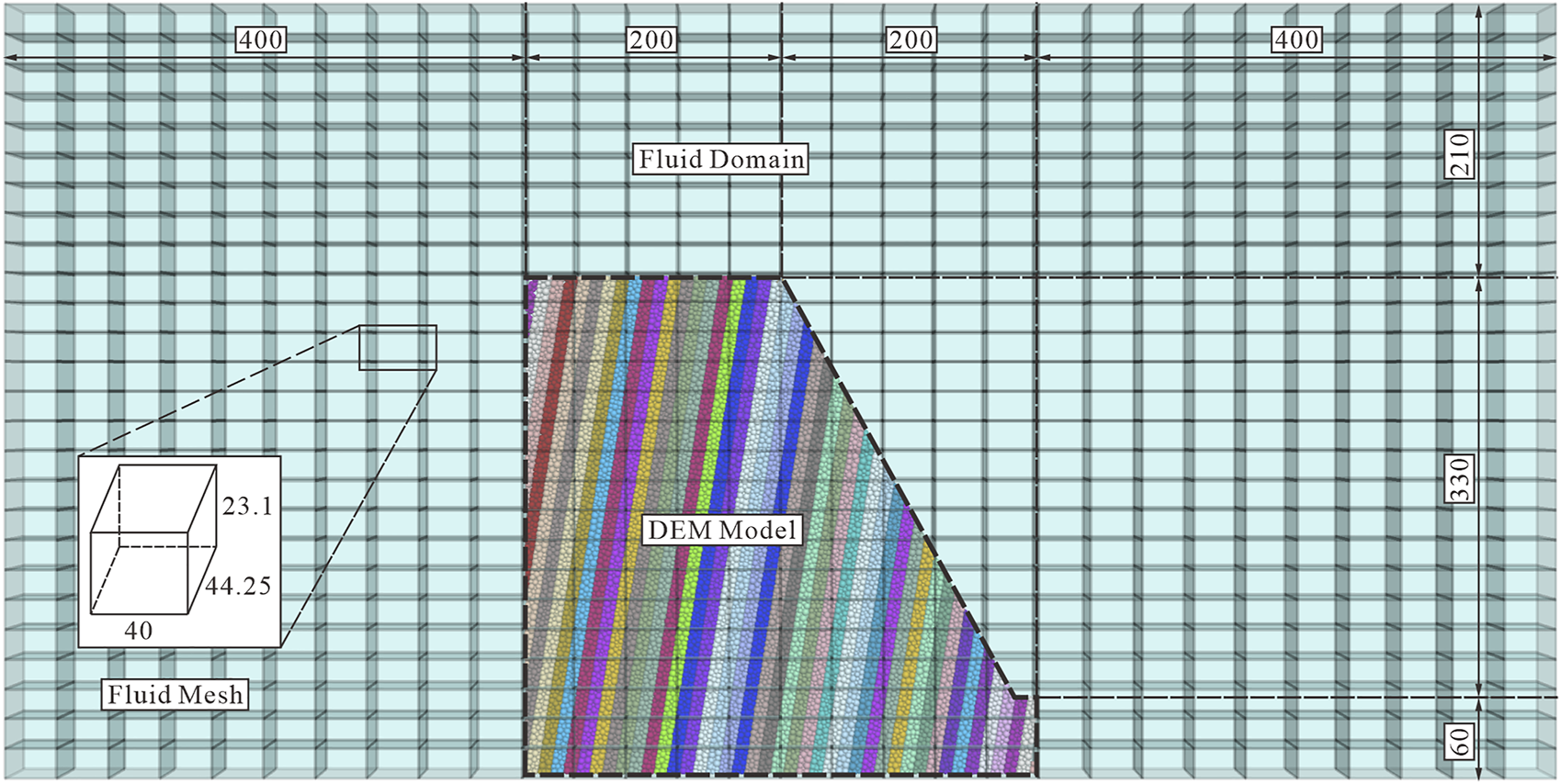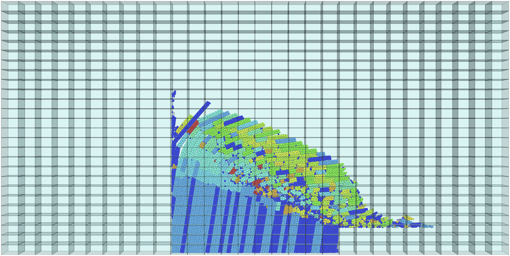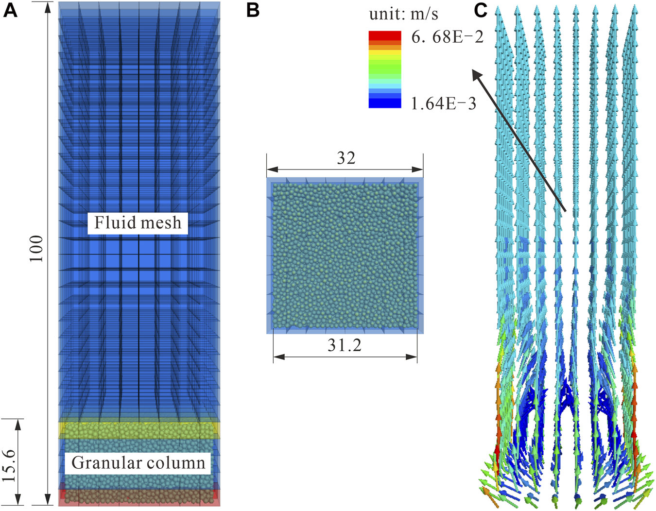 ii. A 32 × 32 × 100-mm cubic shape fluid mesh was generated, and the granular column was allowed to stand still in the fluid phase for 1 s;