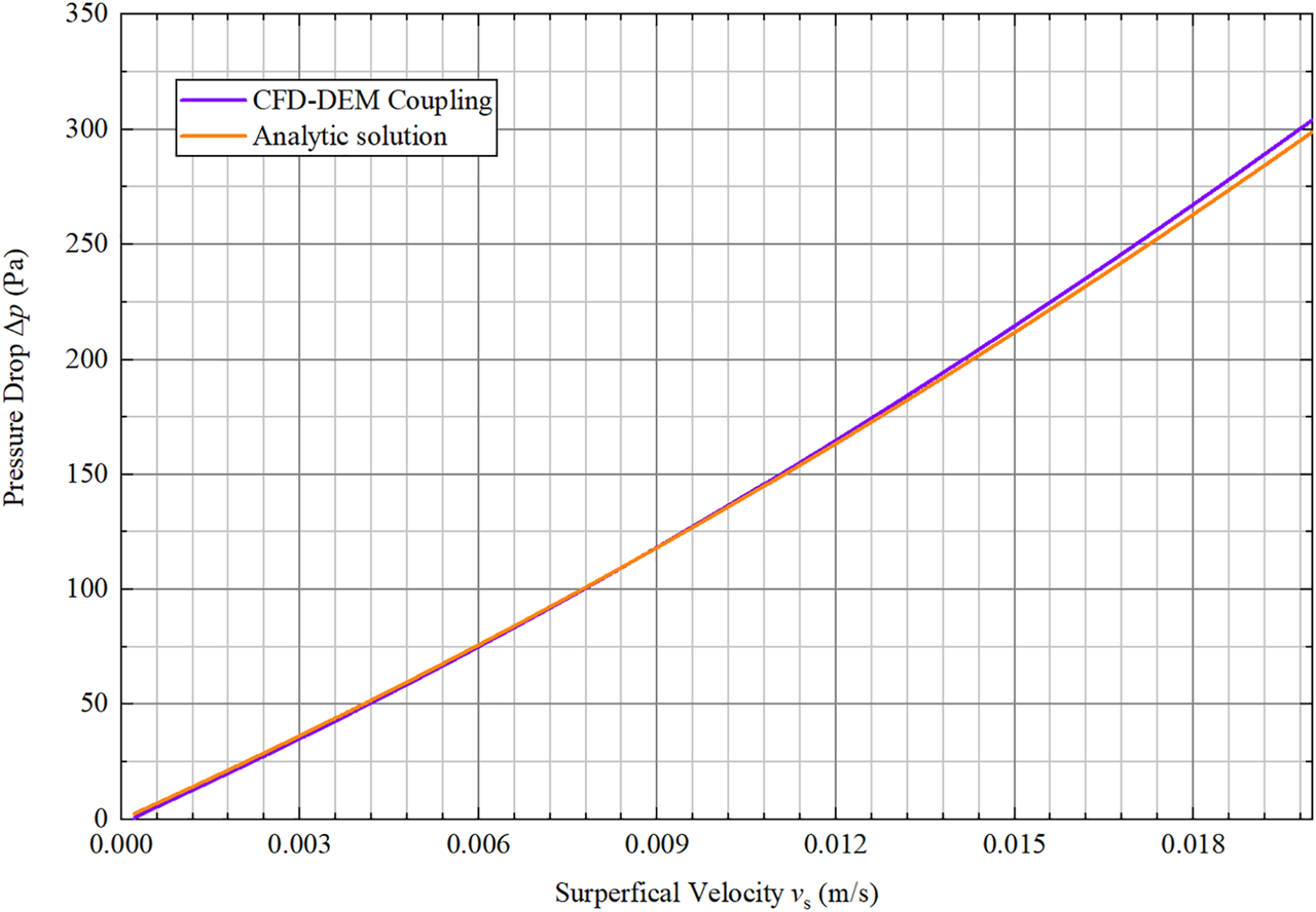 As shown in Figure 3, the pressure drop predicted from the CFD–DEM coupling method agrees well with the analytic solution (Ergun, 1952). Also, the accuracy of the coupling method is proven through this validation case. It should be noted that there will be no fluidization in this simulation as the granular bed is fixed.