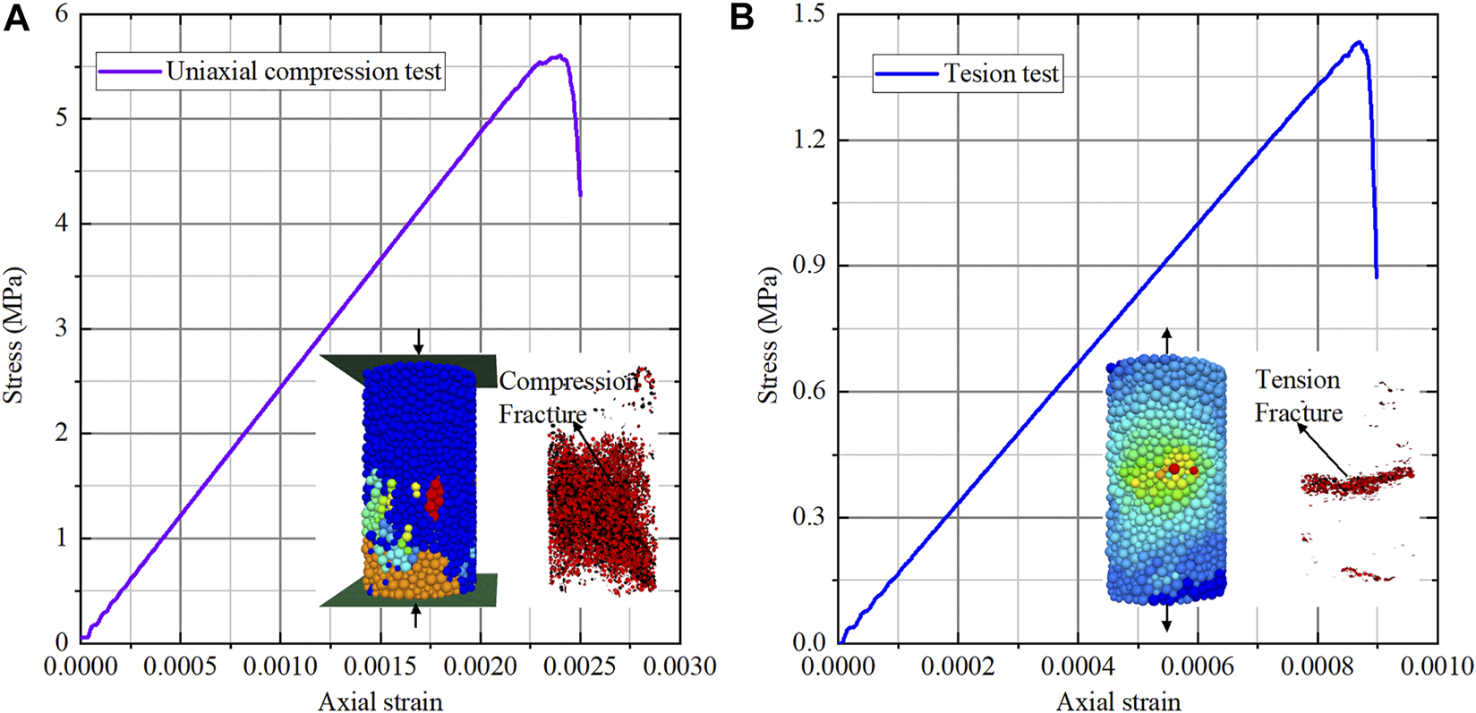 Simulated PFC3D failure in (A) UCS and (B) tension test.