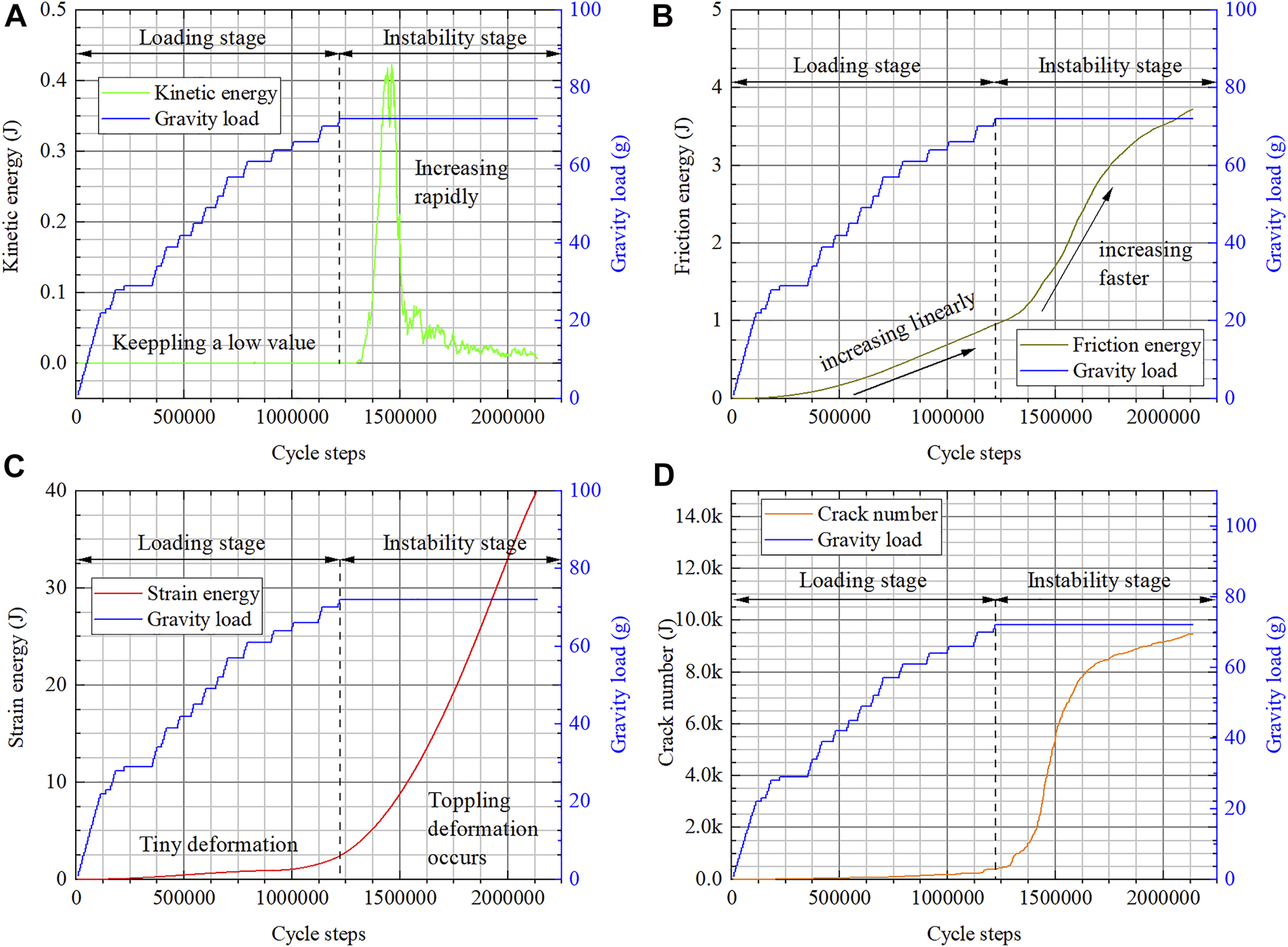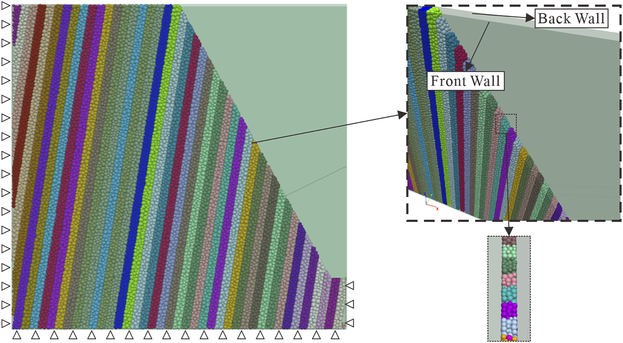 The numerical model in the PFC is an assembly of bonded particles, and all inputted parameters are related to the physical characteristics of these microparticles or the contact model. However, we usually can get only the macro parameters (like Young’s modulus, Poisson’s ratio, and compression or tensile strength) through the laboratory test. These macro parameters cannot be inputted to PFC models directly. Through the numerical laboratory test, we can get the numerical macro physical characteristics and compare it with the actual characteristics to ensure the micro parameters. Before simulating toppling deformation in PFC3D, micro parameter calibration is an indispensable step. In order to reduce the length of the article, the details of the calibration part will not be shown in this study.