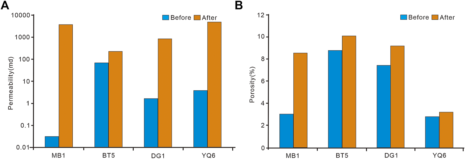 Histogram of carbonate porosity and permeability before and after dissolution (A) comparison of permeability before and after dissolution; (B) comparison of porosity before and after dissolution.