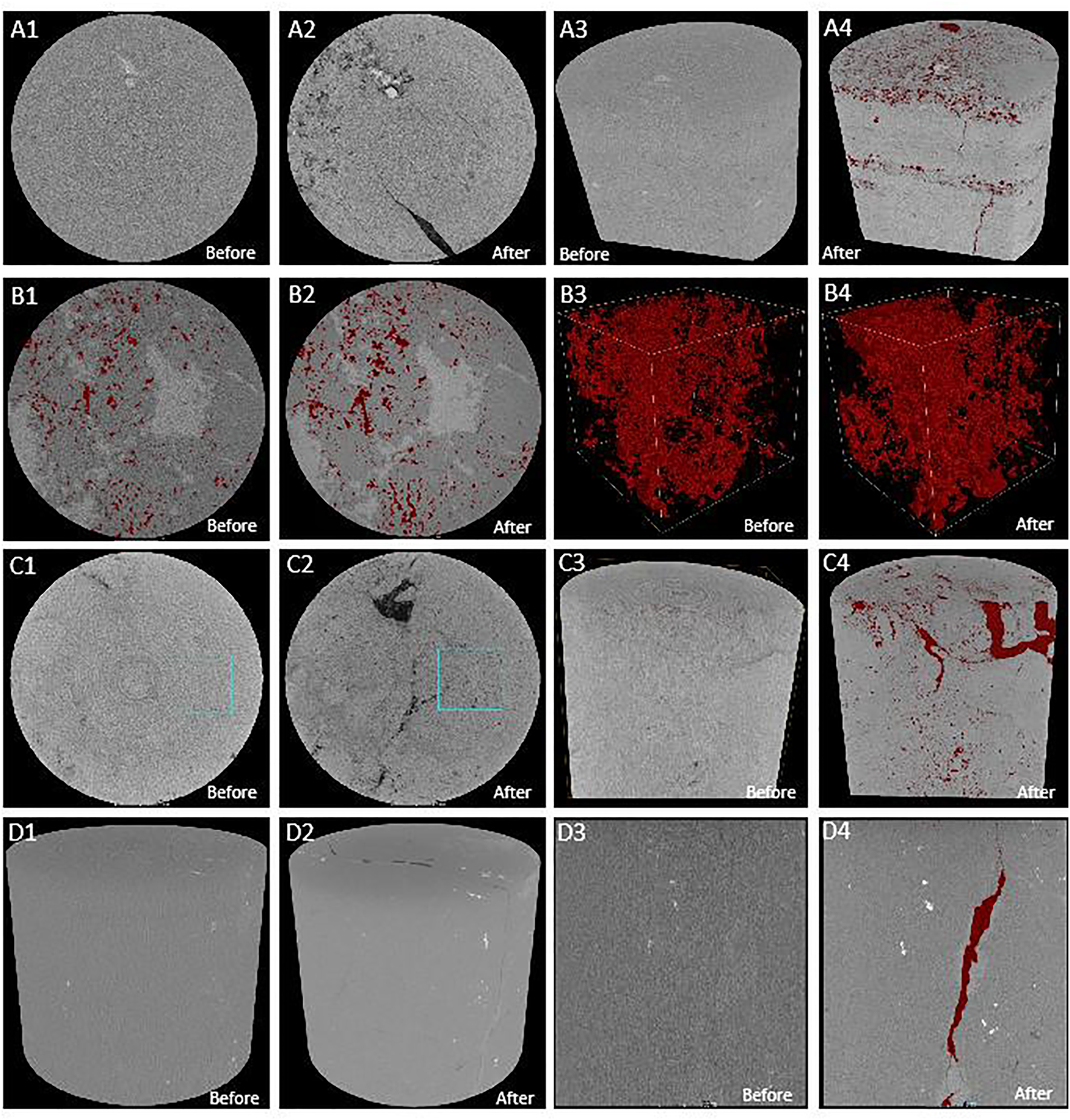 Comparison of CT images of the different reservoirs before and after dissolution (A) Comparison of pore structure of dolomitic limestone of MB1 well; (B) comparison of pore structure of residual fine-crystalline dolarenite of BT5 well (C) comparison of pore structure of fine-crystalline dolostone of XH2 well; (D) comparison of pore structure of medium-crystalline dolostone of YQ6 well.