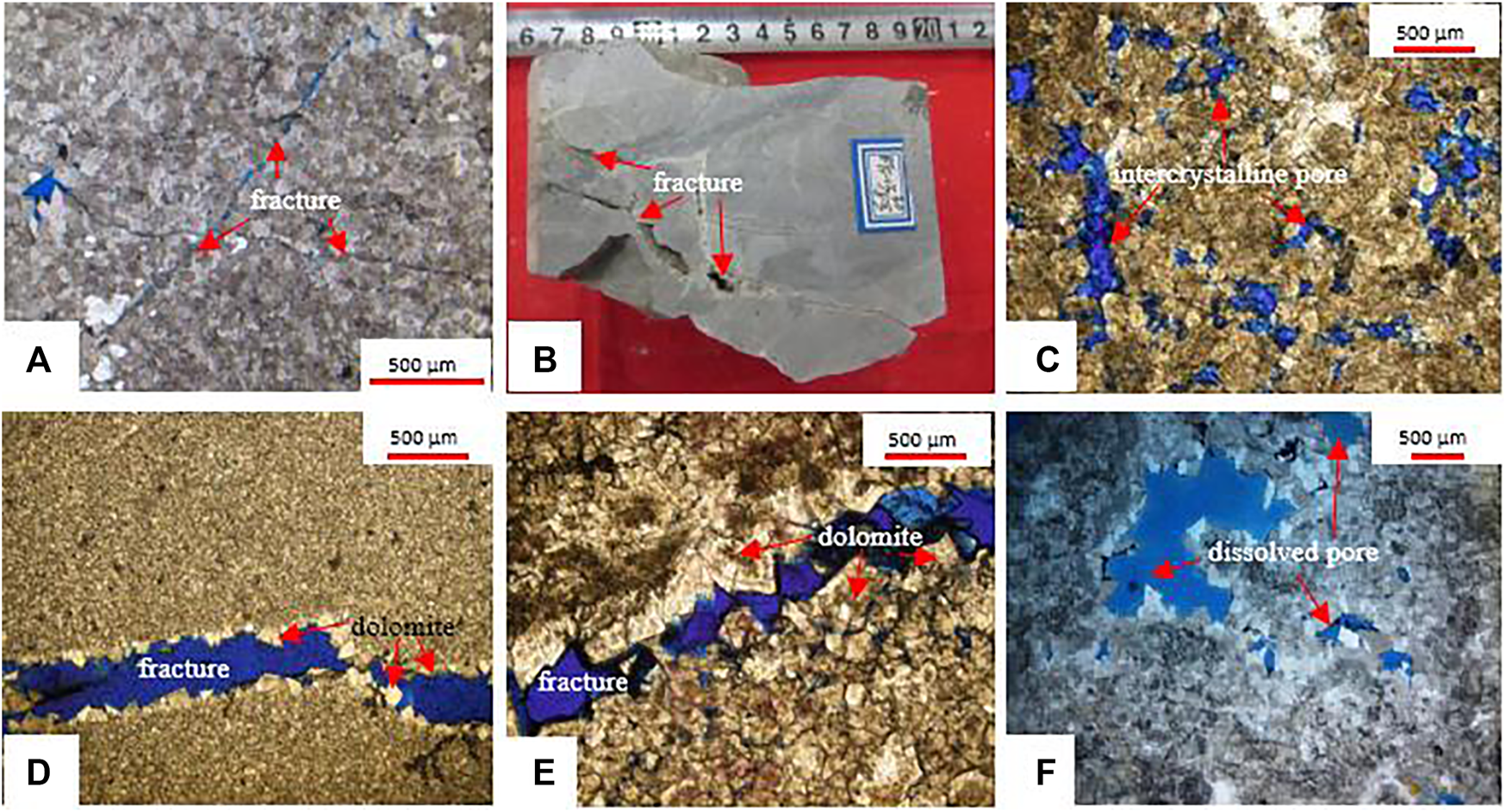 Characteristics of dissolution pores in Cambrian reservoirs. (A) medium-crystalline dolomite, BT5, ∈3, 4,812.9 m, cross-polarized light, ×50 (B) fine-crystalline dolomite, BT5, ∈3, 4,811.01–4,811.10 m; (C) residual fine-crystalline dolarenite, BT5, ∈1, 5,784.8 m, plane polarized light, ×50 (D) fracture filled with allochthonous dolomite, XH2, ∈35,595.761 m, blue thin sections, plane polarized light, ×50; (E) fine-crystalline dolostone, YQ6, ∈37,119.93 m, blue thin sections, plane polarized light, ×50; (F) fine-crystalline dolomite, TS1, ∈37,875.66–74 m, blue thin sections, plane polarized light, ×50.