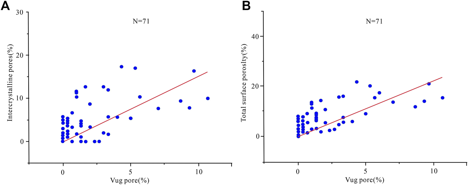 Relationship between dissolution pores and surface porosity of Cambrian reservoirs in Tarim Basin (A) Intercrystalline pore vs. dissolution pore; (B) total surface porosity vs. dissolution pore.