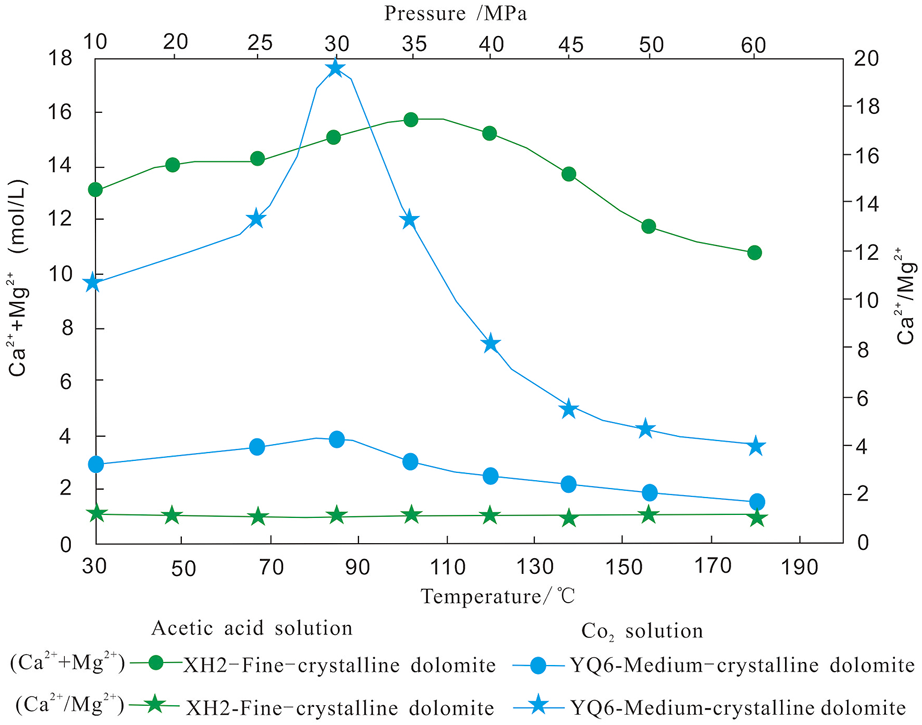 The temperature and pressure are the important factors that affect the carbonate dissolution reaction under a deeply buried environment. Figure 6 reveals the variation of the concentrations of calcium and magnesium ions with temperature and pressure in the solution fluid. Under the same acidic fluid, temperature, and pressure conditions, the amount of dissolution of dolomitic limestone is larger than that of residual fine-crystalline dolarenite. With the increase in temperature and pressure, the amount of dissolution of dolomitic limestone first increased and then decreased. For higher temperature and pressure, the amount of dissolution of dolomitic limestone decreased sharply to the same amount as that of residual fine-crystalline dolarenite. It shows that the dissolution ability decreases with the increase in temperature and pressure.