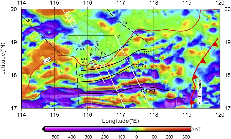 The RTP magnetic anomalies in the IODP drilling area are shown in Figure 7. Sites U1501, U1504, and U1505 surround a small local high-magnetic anomaly and correspond to the outer margin high (OMH) on the L1555 profile (Sun et al., 2016). Ridge A, Ridge B, and Ridge C (Larsen et al., 2018) were divided according to the acoustic basement, and are shown as thin white solid lines in Figure 7.