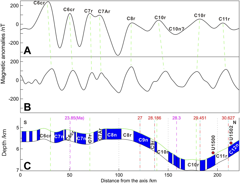 The negative magnetic anomaly region between the two magnetic lineations of C10r is the position of the first ridge jump (Figure 5). The corresponding magnetic lineation jumped 20 km southward near C10n at 28.3 Ma. The second ridge jump was near C6cr on the south side, where it jumped 20 km southward at 23.85 Ma. In the “two jumps” model, the time and position of the second jump are consistent with those in previous research. However, the positive magnetic anomalies of C9r were masked by anomalies at the two sides due to the first ridge jump at 28.3 Ma, which is in agreement with observed magnetic anomalies. In other words, C11r could move continuously toward the north, reaching the north side of U1500, and U1502 was over magnetic anomaly C12n (Figure 5).