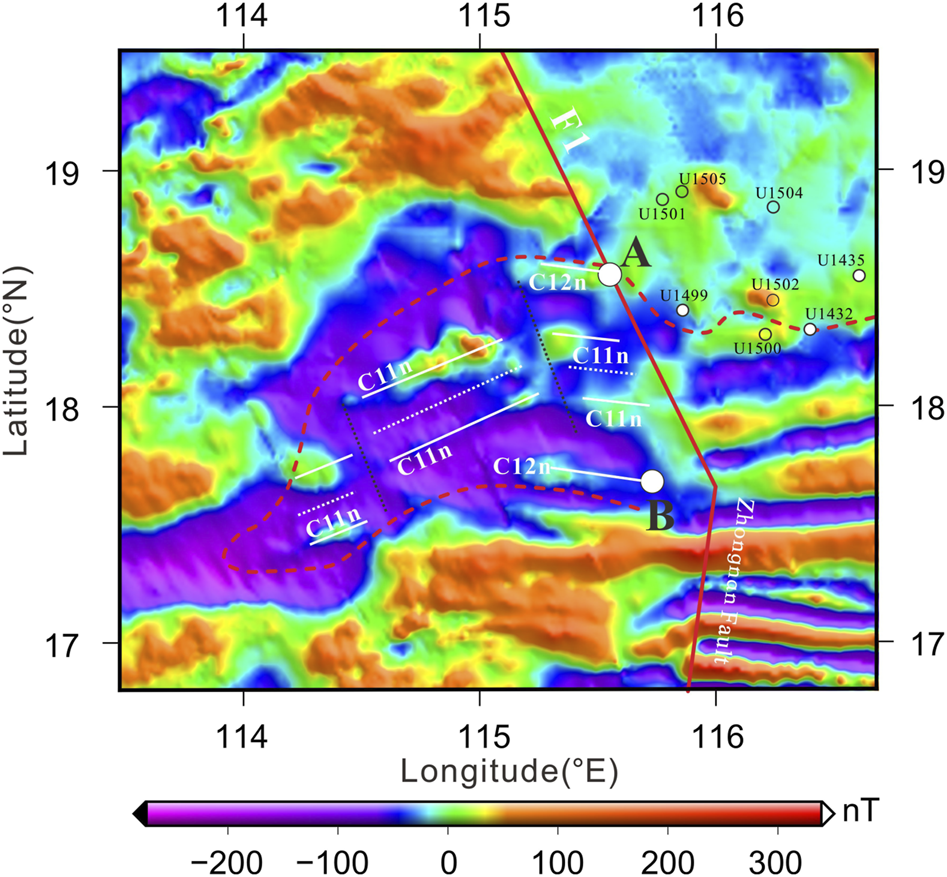 4) C12n is the oldest magnetic lineation in the Northwestern sub-basin (∼30.8 Ma). C11n is the symmetric magnetic lineation near the Shuangfeng seamount (∼29.8 Ma). C10r is the magnetic lineation corresponding to the fossil spreading centre (∼29 Ma), with an average half-expansion rate of approximately 27.2 mm/yr. The Northwestern sub-basin seems to have opened from east to west, with rotation around a fixed point at the west end. Moreover, the north section of the Zhongnan Fault is formed along the trajectory of the conjugation break-up point during seafloor spreading.