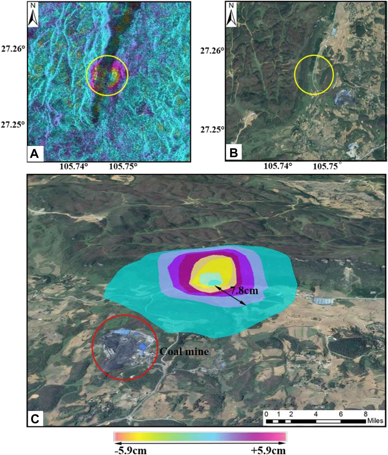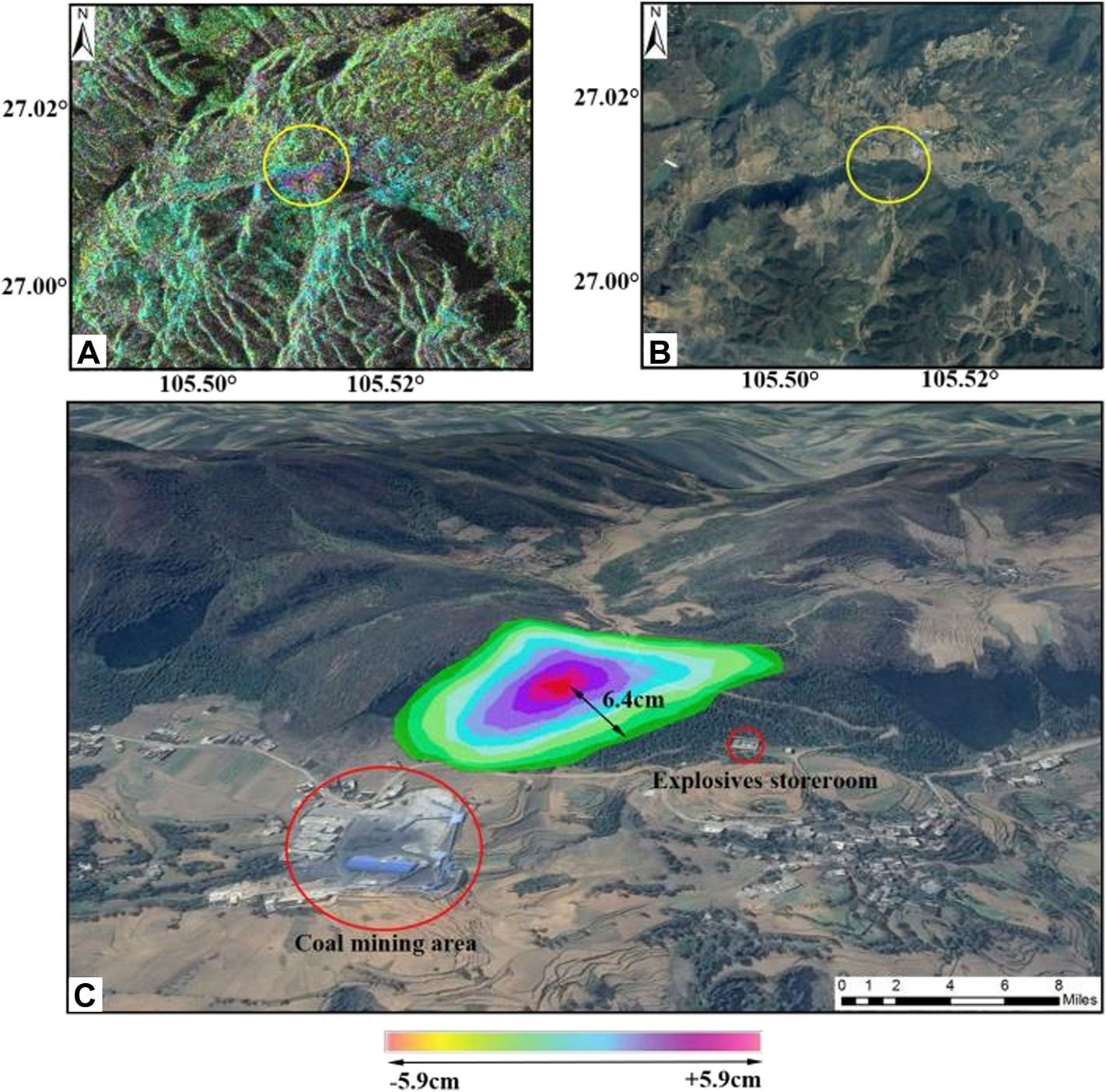 Using the ALOS-2 PALSAR data from 4 September 2016 to 22 January 2017, the local disaster hazards in Yinjiazhai were monitored. The interference between the two scenes constituted a vertical baseline of −167.4 m, and the time baseline was 118 days. Undiscovered hidden points in the landslide account were found in Yinjiazhai of Dafang County, Bijie City. The topography of the area is undulating and mountainous, having many streams and rivers. As typical of karst landscapes, shadows were formed on the radar images. The incidence angle of DInSAR was 36.6° and largely avoided the occurrence of shadows. The landslides in the county mainly occurred in the Quaternary residual strata of bedrock, whereas some occurred in the hard rock and soft rock engineering geological rock group. Collapses occurred mainly in the hard-rock-like strata of carbonate rocks. Figure 3A shows a differential interference fringe map of the Yinjiazhai area, and Figure 3B shows the corresponding geographical position. The lower color scale represents the phase shift corresponding to 11.5 cm [i.e., half the wavelength (23 cm)]. In all the interferograms, several white pixels can be observed, which do not represent real data values. This is due to the geometric distortion, perspective, and shadow effects of the radar signals. In Figure 3C, an enlarged explosive reservoir and coal mining site can be seen on the right and left sides of the mountain, respectively. A landslide body displacement trend is also shown in Figure 3C. There is a large village down in the valley on the right side of the landslide. Thus, landslides could be lethal at this location.