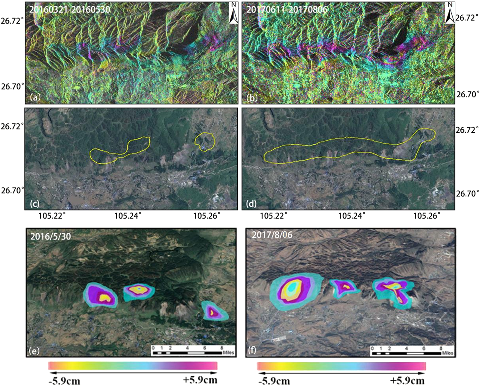The rocks of the study area formed a soft and hard interbedded layer, and a weak structural plane was formed on the contact surface, making the rock and soil easy to slide. The weak structural surfaces were slippery and misaligned, which (Raetzo et al., 2007) favored the production of hidden hazards such as landslides and collapses. A landslide was detected in the town of Zongling in Nayong County. Due to the abundance of mineral resources in the area, artificial mining has caused many geological hazards. In the differential interference fringe diagrams of Figures 8A,B, the topographic phase cannot be completely removed due to the insufficient accuracy of the external DEM used. Figure 8A shows the results of the observations from 2016, and Figure 8B shows those from 2017. Comparing the two figures, it can be determined that the hidden landslide points slipped for two consecutive years, with an average slip of 6.0 cm. Figures 8C,D show the actual locations of this hidden hazard in 2016 and 2017, and Figures 8E,B show the calculated deformation of this area. The geographic coordinates of the landslide area are 26°42′49.17″N, 105°14′29.02″E.
