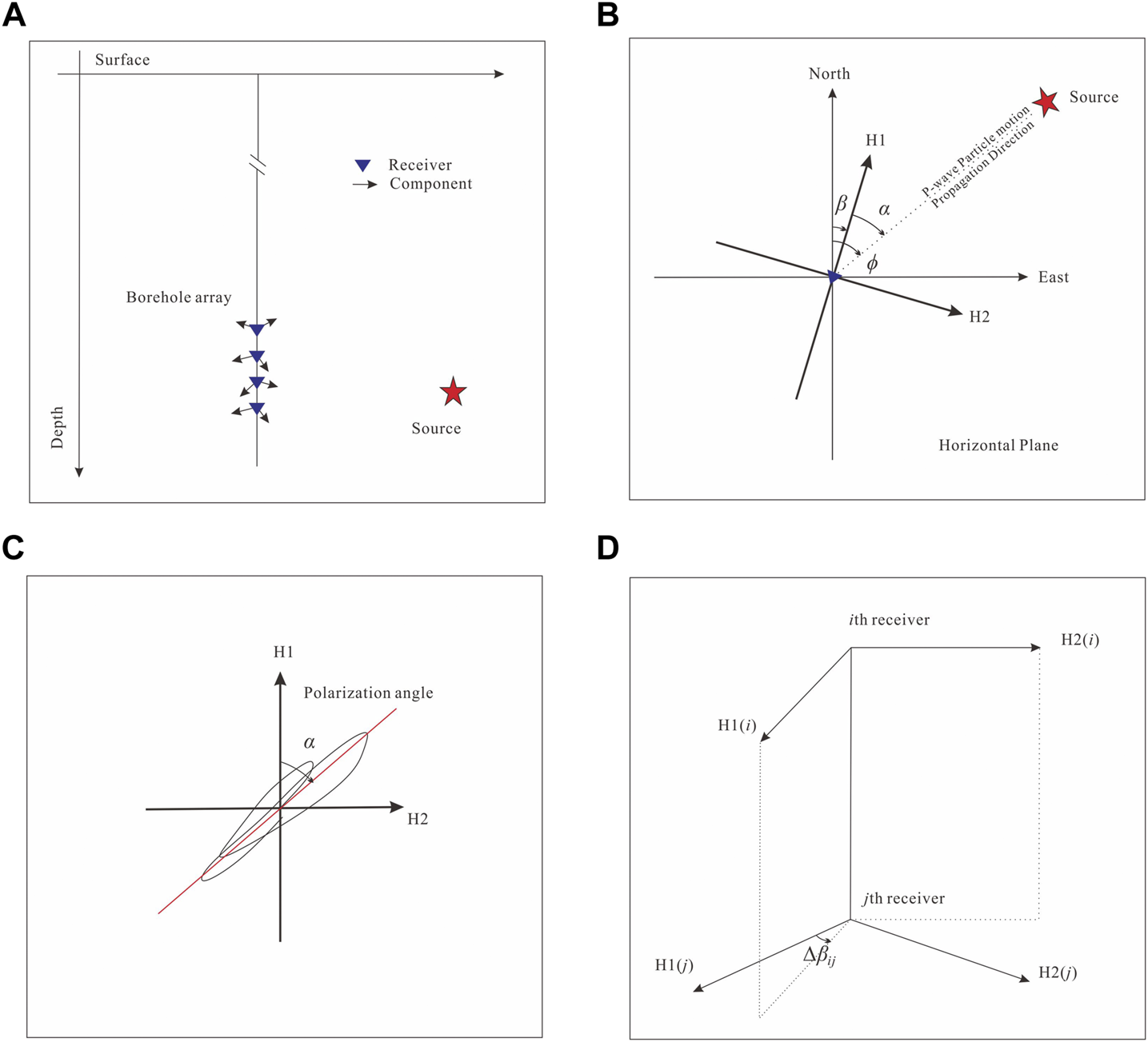 (A) Sketch of a vertical borehole with a linear array of receivers. (B) Illustration of the relationship among three angles: the event back-azimuth, the receiver orientation angle, and the polarization angle of the P-wave. (C) Schematic hodogram of particle motion. (D) Illustration of the relative angle between receivers.