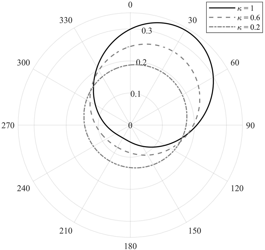 Figure 2 displays the examples of the von Mises distribution functions computed using =30° and different concentration parameters. We can see that as decreases, the shape of the distribution function becomes circular. In this study, we calculate the von Mises distribution function using L and .