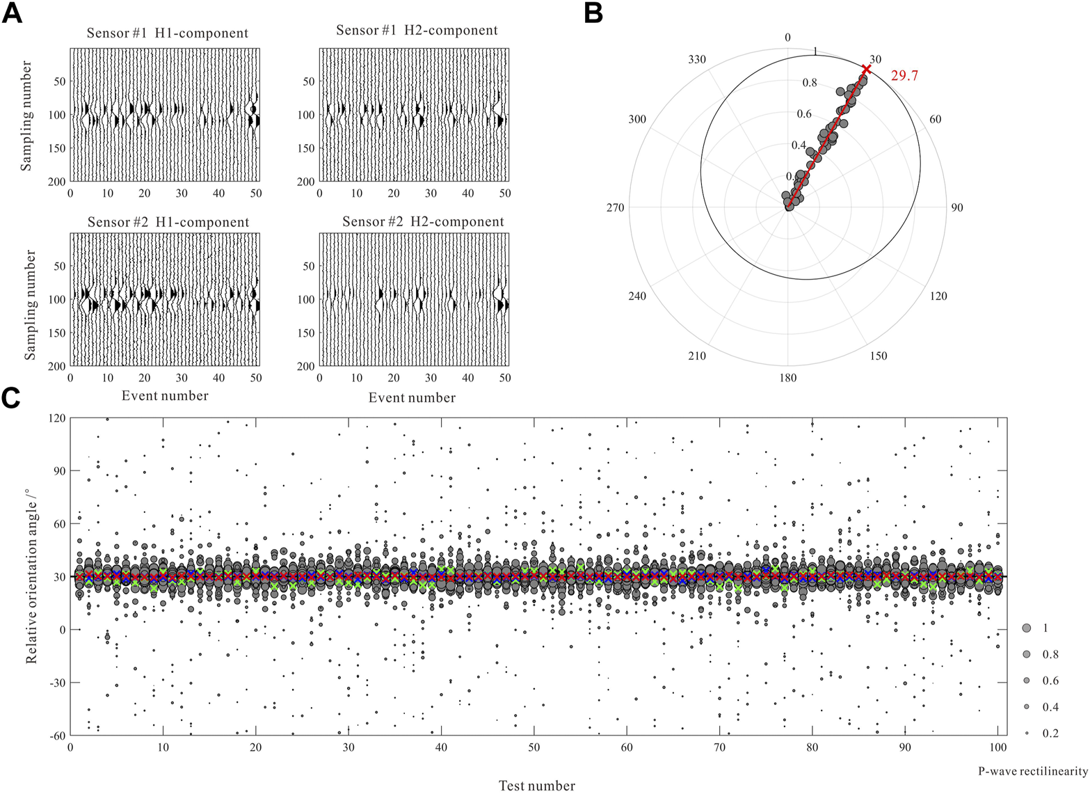 Comparisons of the relative orientation angle calculated by the proposed method and the conventional approaches. (A) Waveforms of the P-wave of 50 microseismic events recorded by 2 receivers. (B) The distribution of the polarization angle differences and the corresponding rectilinearity (the gray dots), and the normalized global probability distribution function (the black curve). The red cross indicates the angle corresponding to the maximum probability density. (C) The results of 100 groups of synthetic recordings with different random noises. The red, green, and blue crosses represent the results of the proposed method, the average values of the orientation angles at different receivers, and the angles corresponding to the receiver having the maximum rectilinearity, respectively. The size of the dots denotes the P-wave rectilinearity.