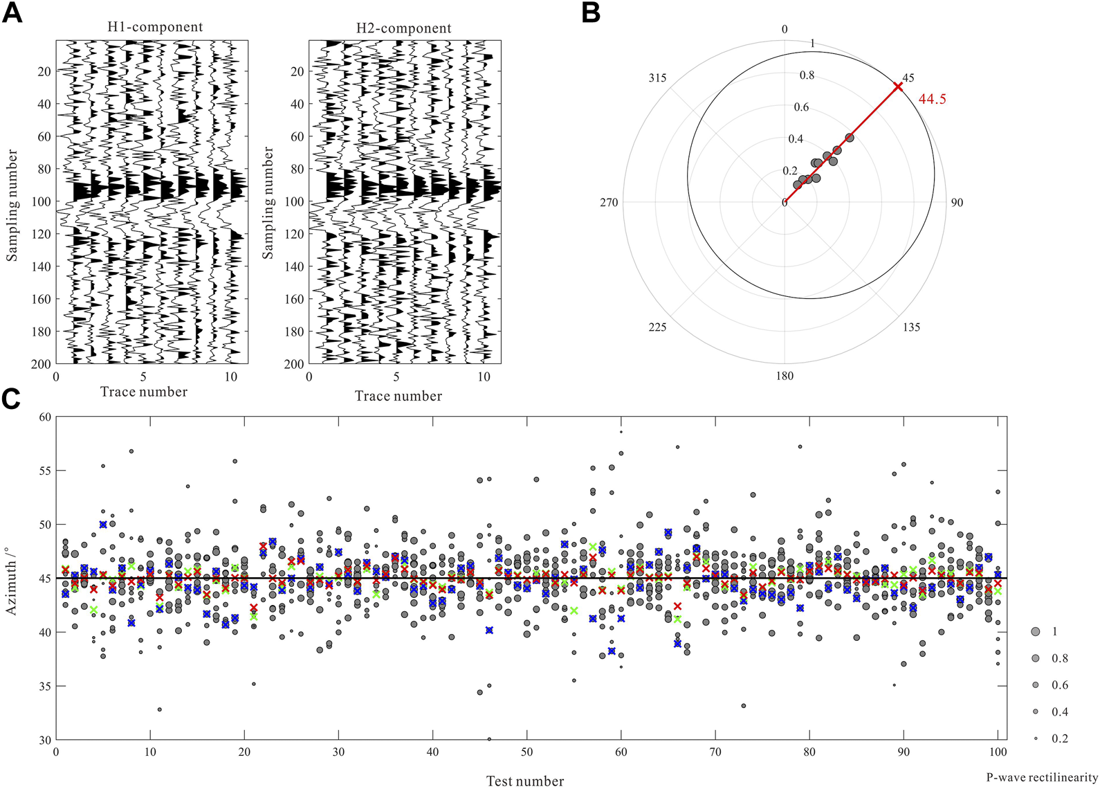 The second synthetic data example illustrates the accuracy in determining the event back-azimuth by the probability distribution function. Note that different from Figure 3A, Figure 4A shows the two horizontal components of the P-wave of one synthetic microseismic event recorded on ten receivers. The true back-azimuth of this event is set to 45°. Figure 4B shows the normalized probability distribution of the event back-azimuth. In this case, the angle corresponding to the maximum (equal to 1, denoted by the red cross) of the global function is 44.5°, which is 0.5° away from the true value. Similar to the first synthetic test, we also repeat this test 100 times and the results are shown in Figure 4C. It is shown that the results of the proposed method (the red crosses) are more accurate than the average values of the azimuths determined for all receivers (the green crosses) and the angles corresponding to the maximum rectilinearity (the blue crosses). The standard deviations of these three sets of results are 0.83°, 1.04°, and 1.59°, respectively, indicating that our method can also obtain more accurate event back-azimuth.