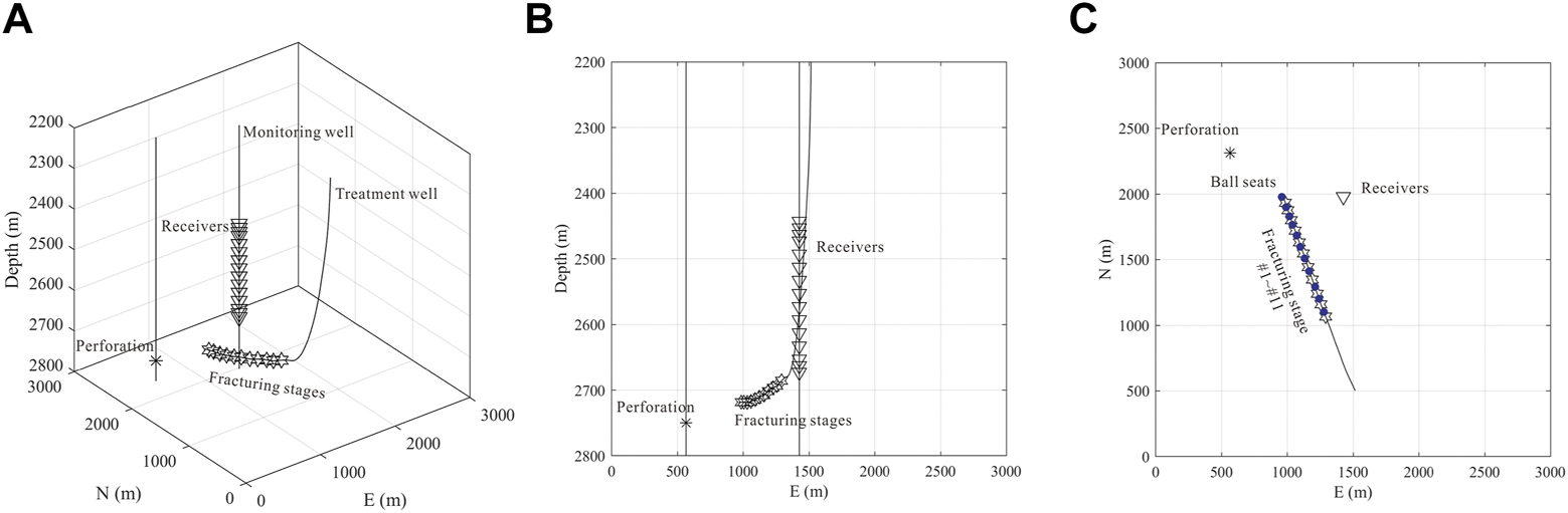 In this section, we demonstrate the performance of the proposed method on real dataset. The real dataset was acquired from a fractured tight reservoir in the Shengli oil field of eastern China. A downhole array composed of 15 levels of 3-C geophones is deployed in a vertical monitoring well at depths from 2443 to 2673 m. The duration of the monitoring data is more than 27 h and the sampling interval is 0.5 ms. A perforation shot is fired in a third well located approximately 920 m northwest of the monitoring well before the hydraulic fracturing stimulation begins. Figure 5 shows the survey geometry of the real case. A total of 521 microseismic events are detected in the monitoring data, including 11 ball-drop events with known locations (Figure 5C). The P-wave arrival times of the microseismic events are determined using the joint STA/LTA-polarization-AIC method (Tan and He, 2016), and then refined by the global optimization method based on iterative cross-correlation (Leng et al., 2022).