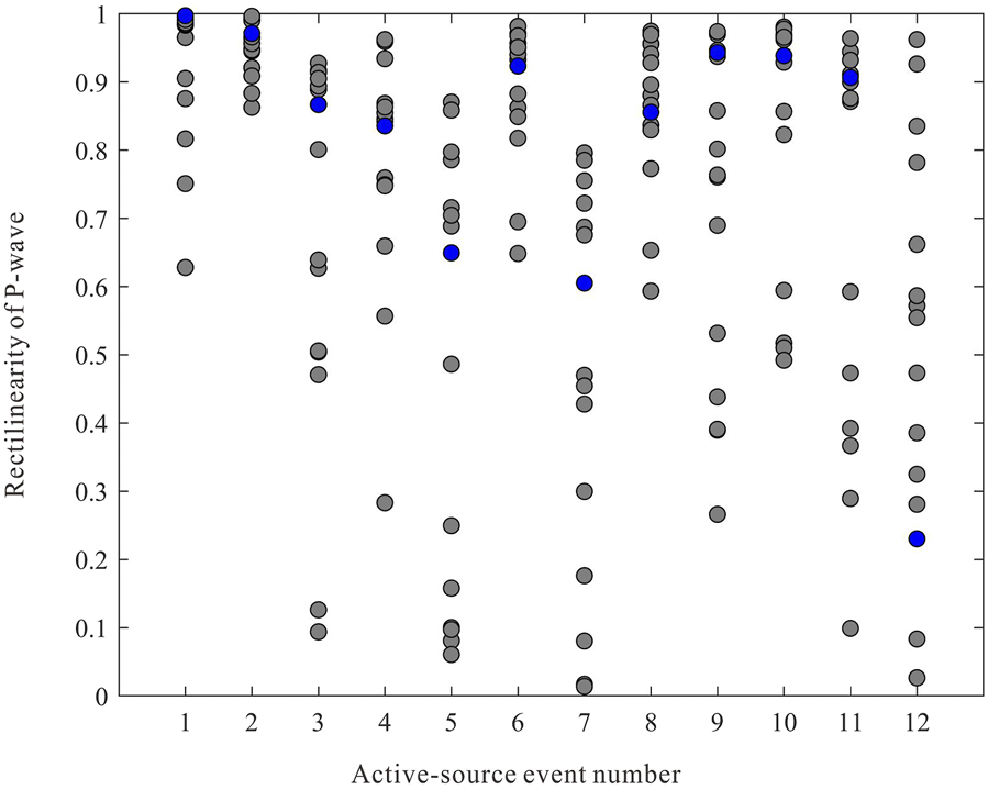 P-wave rectilinearity on different receivers from the 12 active-source events. The first event is the perforation shot and the others are ball-drop events. The blue circles represent the 6th receiver.