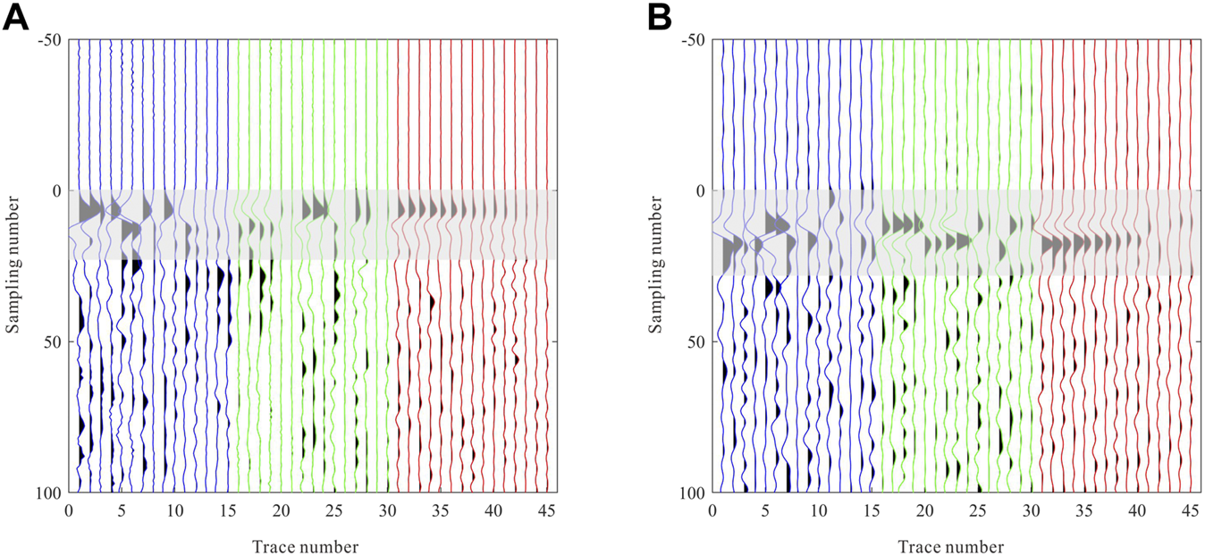 P wave after moveout correction. (A) P wave of the perforation shot event. (B) P wave of a microseismic event. Blue, green and red lines represent H1-, H2-, and vertical components respectively.