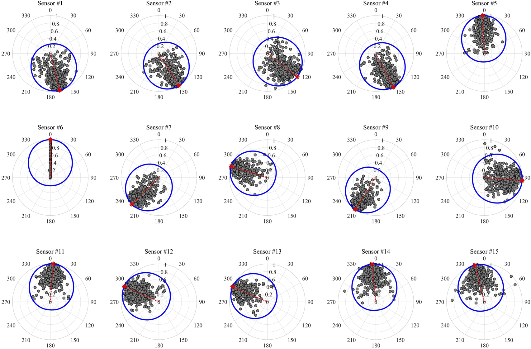 The receiver orientation results obtained from above two events are listed in Table 2. Because the P-wave of perforation shots on the 6th receiver in Figure 6 generally has the maximum rectilinearity, we choose the 6th receiver as the reference to calculate the relative orientation angles of other receivers. The relative angle differences and the average rectilinearity values from all recorded events are then utilized to construct the von Mises distribution functions and formulate the global functions. The relative orientation angles obtained from the perforation shot are used to correct the calculation of the relative orientation angles in all events for resolving the 180° ambiguity. Figure 9 depicts the polar diagrams of the relative angle differences and the average rectilinearity values from all events at those receivers. The relative receiver orientation angles can be obtained by calculating the maximum values of the probability density functions (denoted by the red crosses in Figure 9).