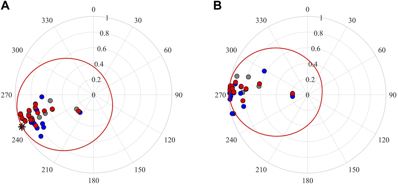 Distributions of the event potential back-azimuths on the 15 receivers by three approaches. (A) The back-azimuths of the 3rd ball-drop event. The black asterisk in Figure 10A represents the true ball-drop event azimuth. (B) The back-azimuths of the microseismic event (as shown in Figure 7A). The gray, blue, and red circles represent the results of those three methods in Table 2. The radius coordinate denotes the rectilinearity of the P-wave. The red curve represents the normalized global probability distribution function by using the back-azimuths from the proposed method.