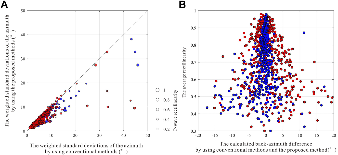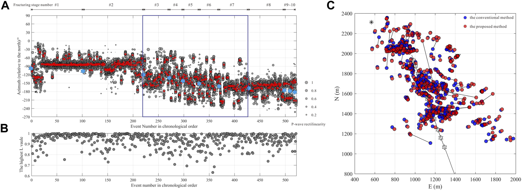 (A) Distributions of the 521 microseismic event back-azimuths. The gray dots represent the distribution of the potential back-azimuth angles after receiver orientation. The size of the dots reflects the P-wave rectilinearity. Red crosses represent the event back-azimuths calculated by the proposed method. The blue asterisks represent the ball-drop events. (B) Distributions of the P-wave rectilinearity average values of the 521 microseismic events. (C) Comparison of the source locations of the microseismic events by the conventional method and the proposed method.