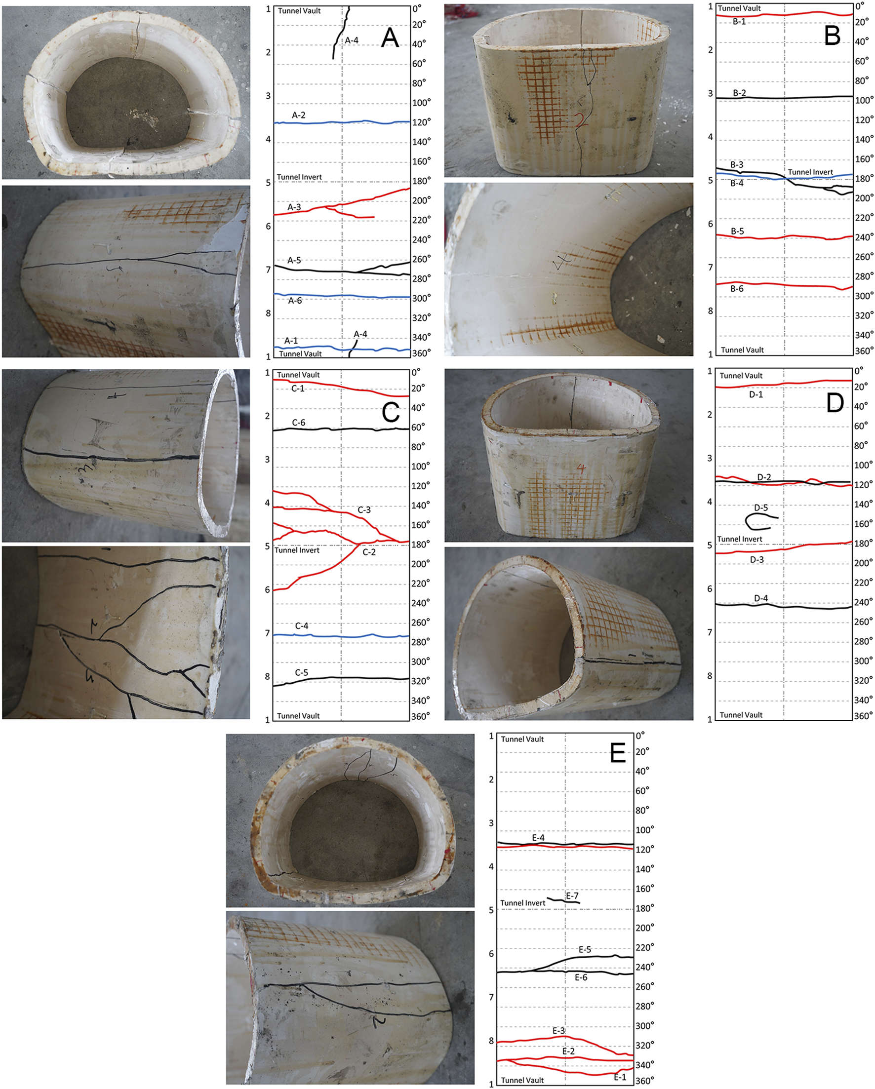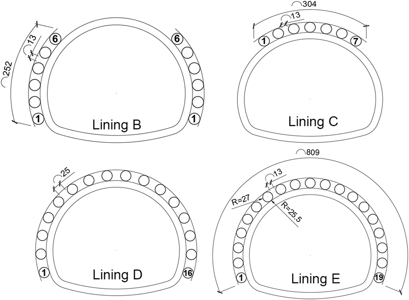 A lining is not equipped with the Resistance-limiting layer; B lining is equipped with the layer in the arch waist and side wall; C lining is equipped with the layer in the vault; D lining standard arrangement of the layer; E lining is sparsely equipped with layer. The design of the layer arrangement is shown in Figure 6 shown. The test arrangement of the Resistance-limiting layer is shown in Figure 7 below and the test working conditions are shown in Table 1 below.