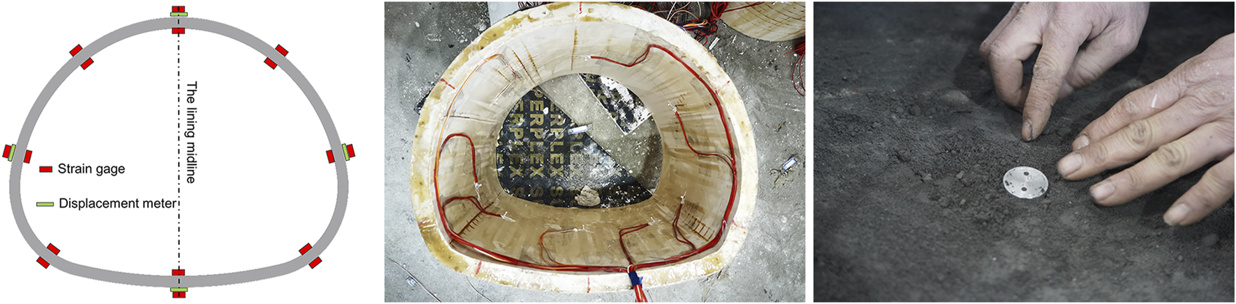 As the tunnel invert was not the main study area for this test, There is no Resistance-limiting layer in the tunnel invert. The test mainly considers two influencing factors to the damping effect: the location of the Resistance-limiting layer and the layer density. The strain response of the tunnel lining, the structural internal force response, and the lining damage form were analyzed.