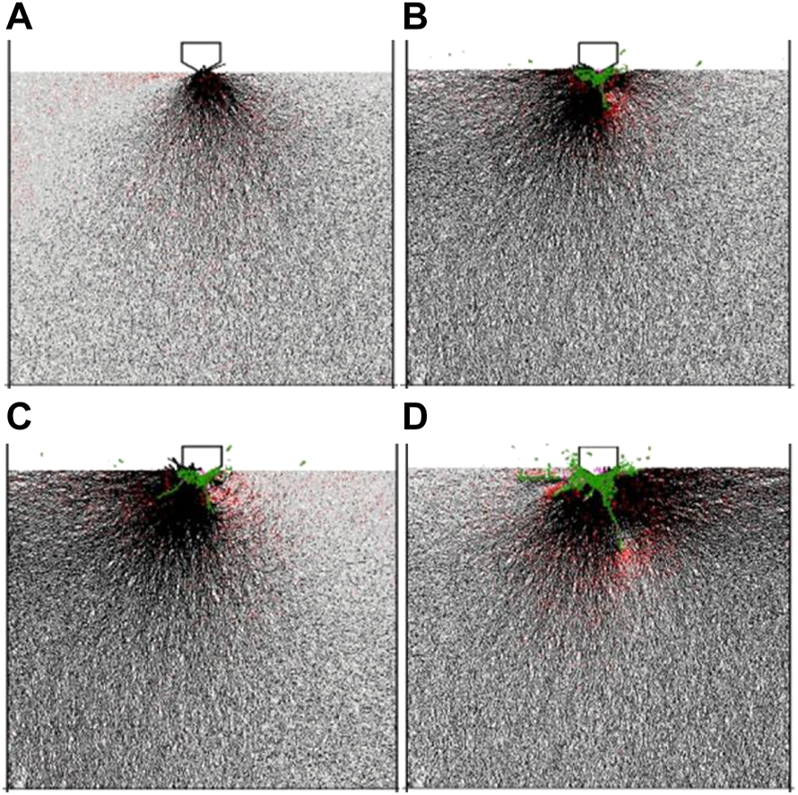 Simulation of the failure evolution of the complete cutting model (A) 0.1 mm (B) 2.5 mm (C) 3.6 mm (D) 5 mm (black for compression/red for tension, dark green for tensile cracking/pink for shear cracking).