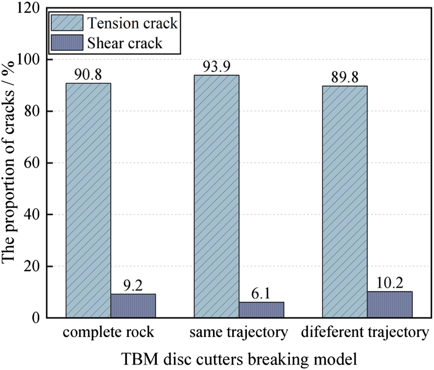 Figure 9 shows the histograms of the percentage of tensile and shear cracks for different rock breaking models. As can be seen from the figure, the percentage of tensile cracks to total cracks being 90.8%, 93.9%, and 89.0%, respectively, for the complete cutting model, the same trajectory cutting model, and the different trajectory cutting model. This phenomenon shows that the above three rock breaking models are dominated by tensile failure and supplemented by shear failure in the mesoscopic.